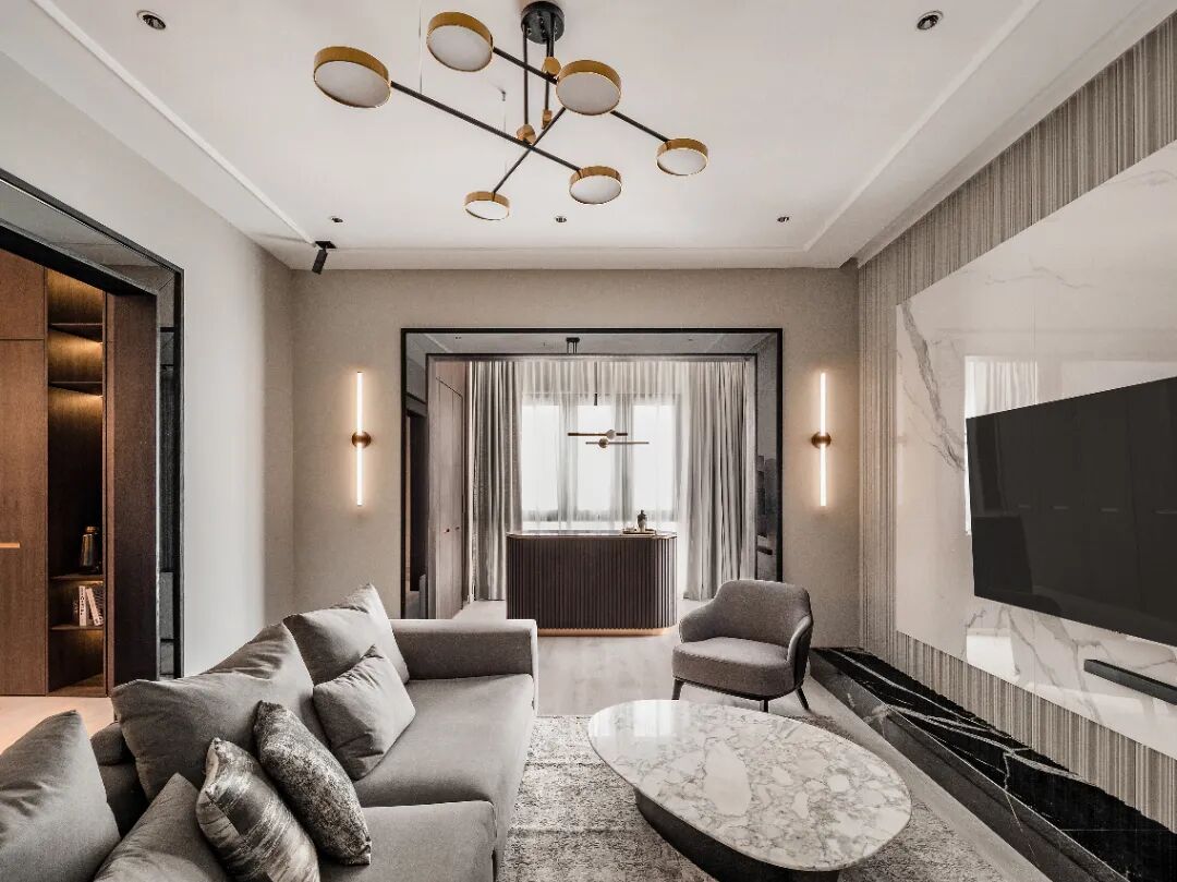 因此,设计师对门厅重设了布局,并增添了卧室隐藏门的设计,如此一来,视觉的重点便可以转移至长廊景观。