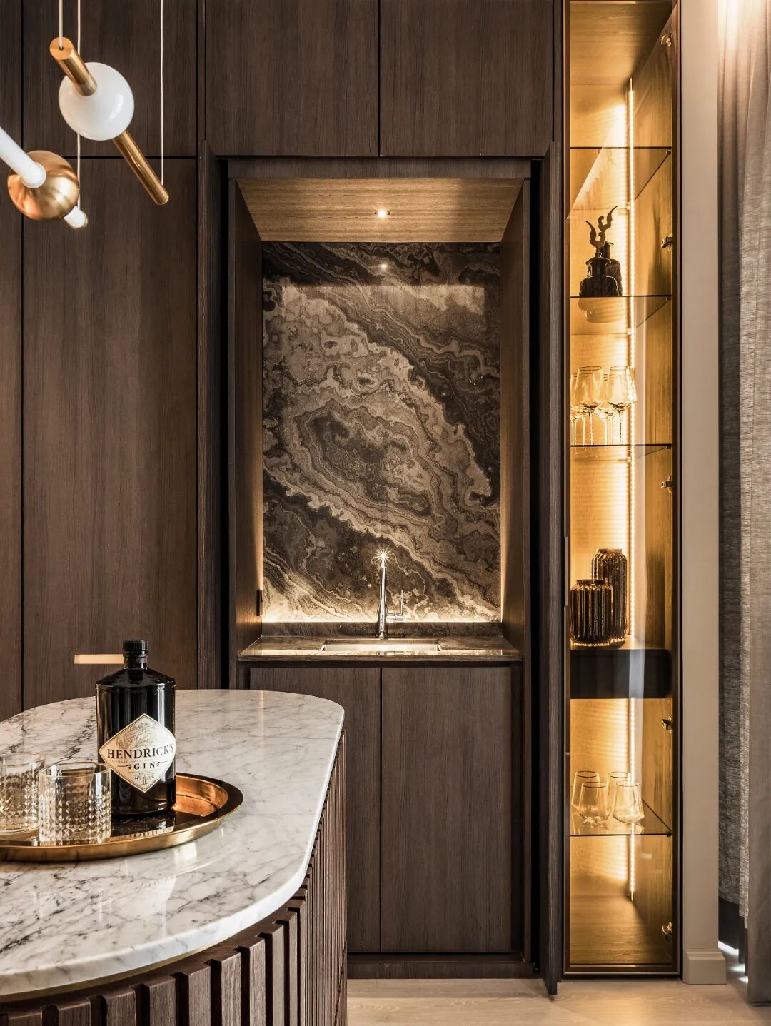 比如,选用了具有异国情调纹理和图案的意大利Arabescato Orobico大理石,去锻造石材家居物件,用于打造岛式柜台和干式厨房橱柜抽屉。正是由于对材料的严格把控,最终才呈现出一件件有个性的艺术品,为整个内部空间设计锦上添花。