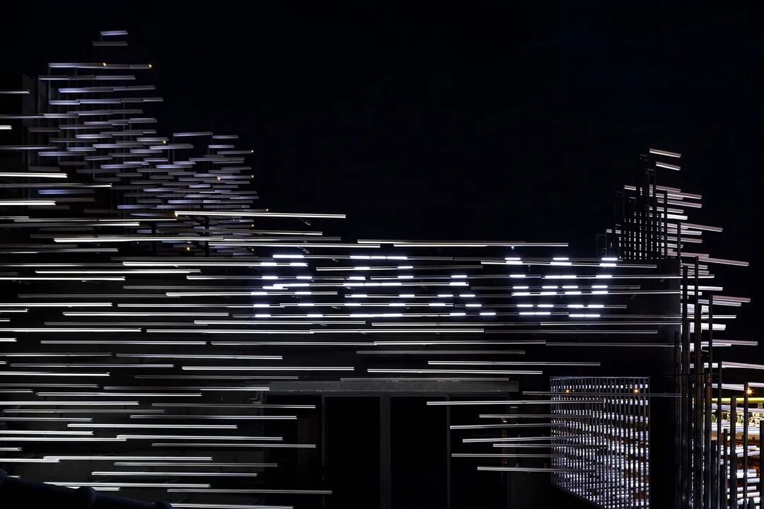 其立面由数万根铝条包覆,每根铝条的颜色与纹路都略有差异,如同蒲公英般每根羽毛都不同;而长短不一的铝条结合LED照明,从正立面延伸至两边侧立面,再笔直贯穿西侧“孔洞”空间,过滤并纾缓外部环境的喧嚣浮躁,引导参访者至一处静谧的展览场所。