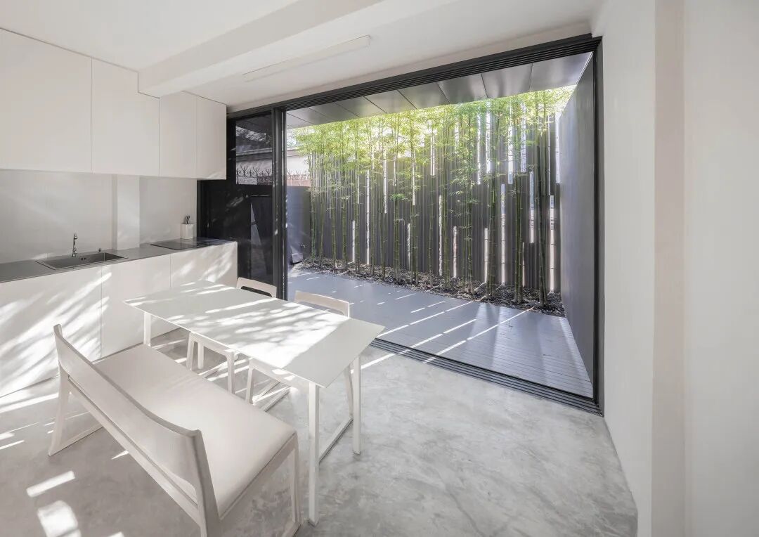 在一层空间未安装任何空调系统,这在常年近40度的热带泰国气候中,设计以孔洞连结前庭与后院,并引入泰式街道巷弄常见的穿堂风作为一种亲近自然的新生活方式;二层空间则暴露原柱梁结构,并体现斜屋顶那高宽比差异较大的尺度感,以对比一层紧凑二层松散的场所氛围。