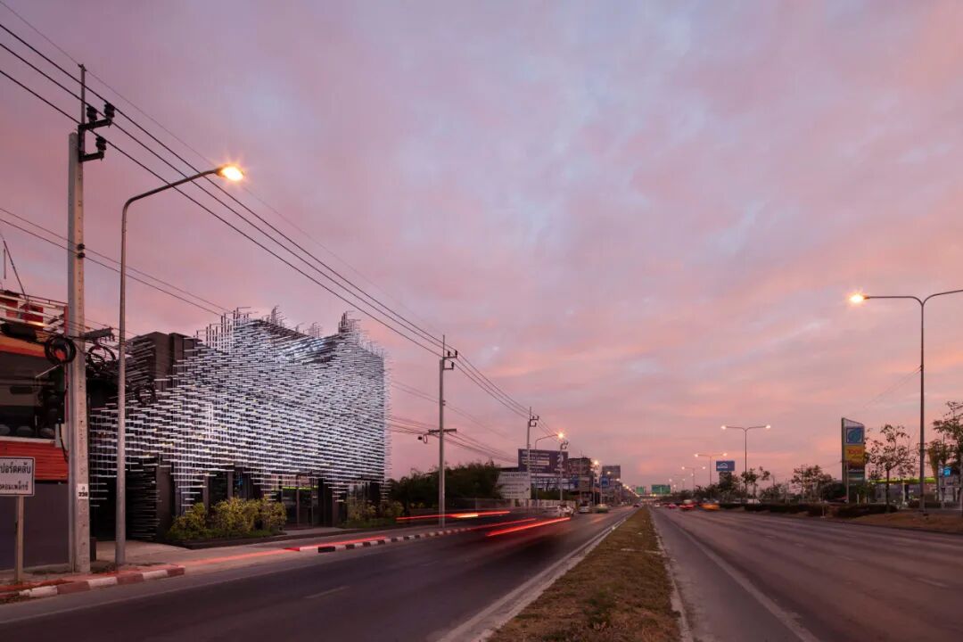 MoMA设计过程从一开始街道常见的铝招牌作为研究对象,随后将铝材作为单体元素串连至整体建筑。即便MoMA仅是城市中的一个建筑体,但透过开发与研究铝构件断面,从而打造出特殊的建筑肌理感,替充斥著钢筋水泥的泰国城市,重新找到另种新地域性。