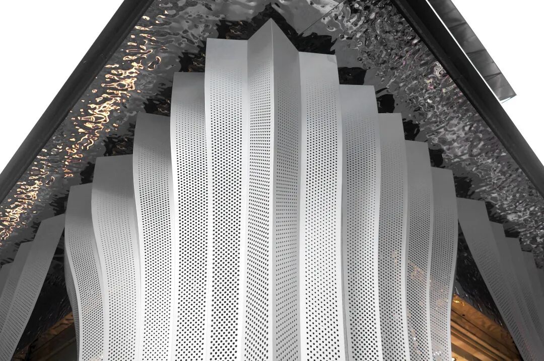 新外⽴⾯借⽤铁闸般的折叠形态,利⽤冲孔的图案变化和引⼊曲线美学,软化了⼀股钢铁般的硬朗,营造⼀个轻盈柔软的外观,如轻纱⼀般飘逸。