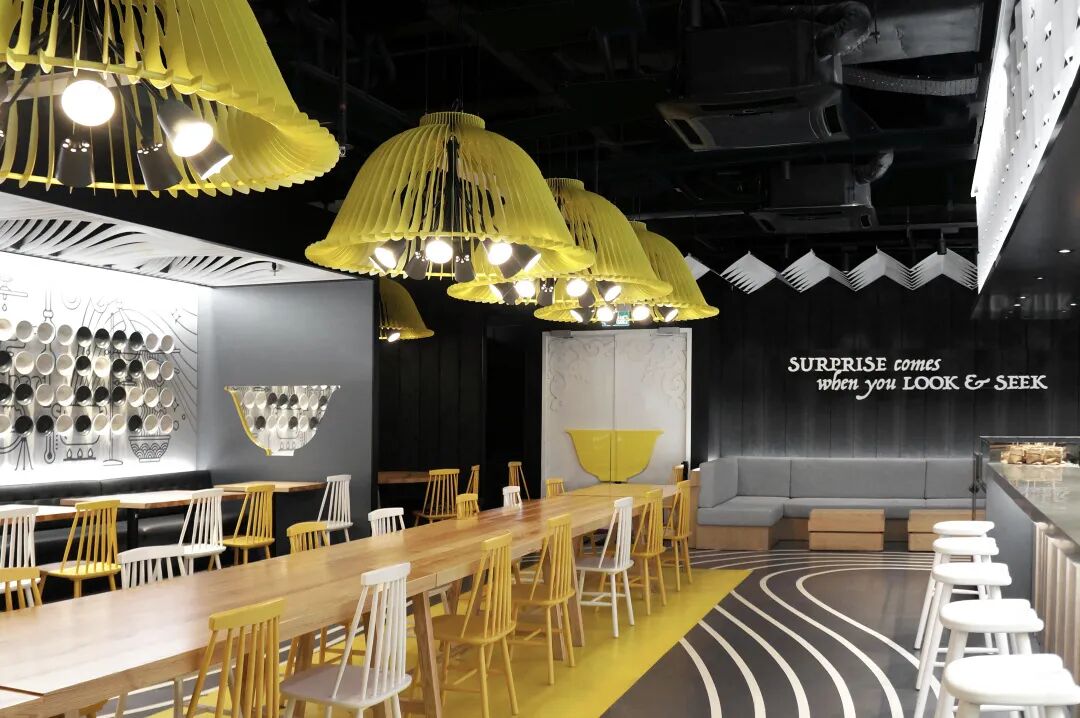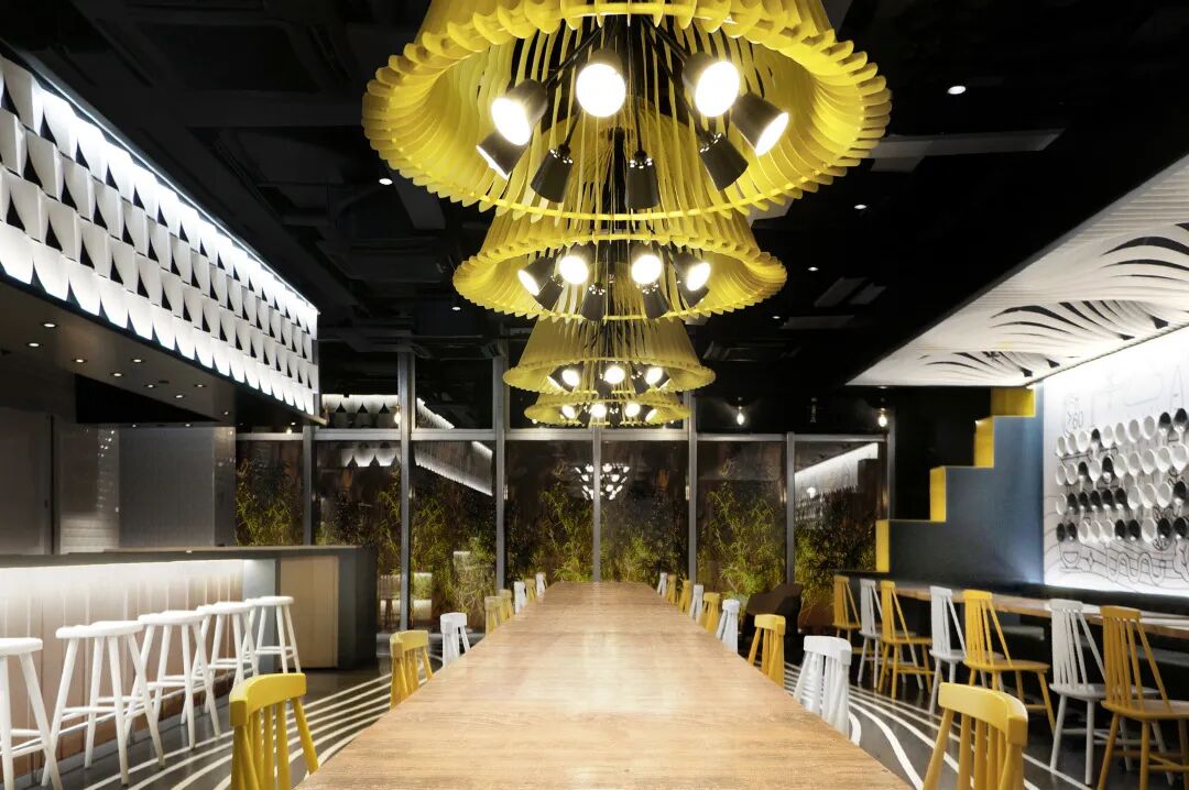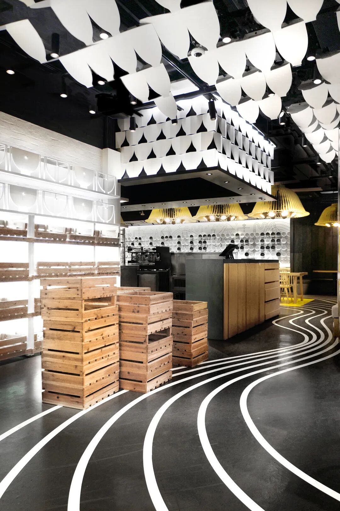进⼊餐饮空间有如置⾝于被⽡解的太空中,“碗”飞来飞去,在不同空间中,⽤不同的形态呈现眼前。