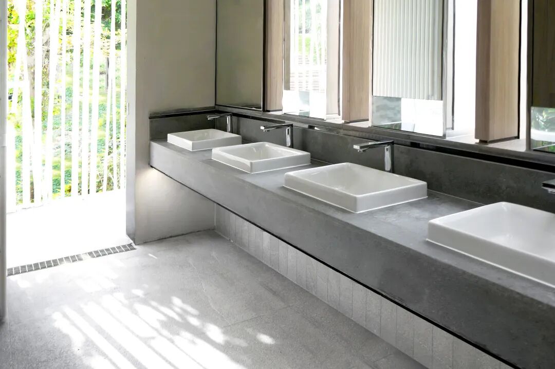 ⽇出⽇落时,光线从外⽴⾯的缝隙中延伸⾄室内,洗⼿盆外的景观被玻璃和镜⾯的折射引⼊室内,使室内空间豁然开朗。