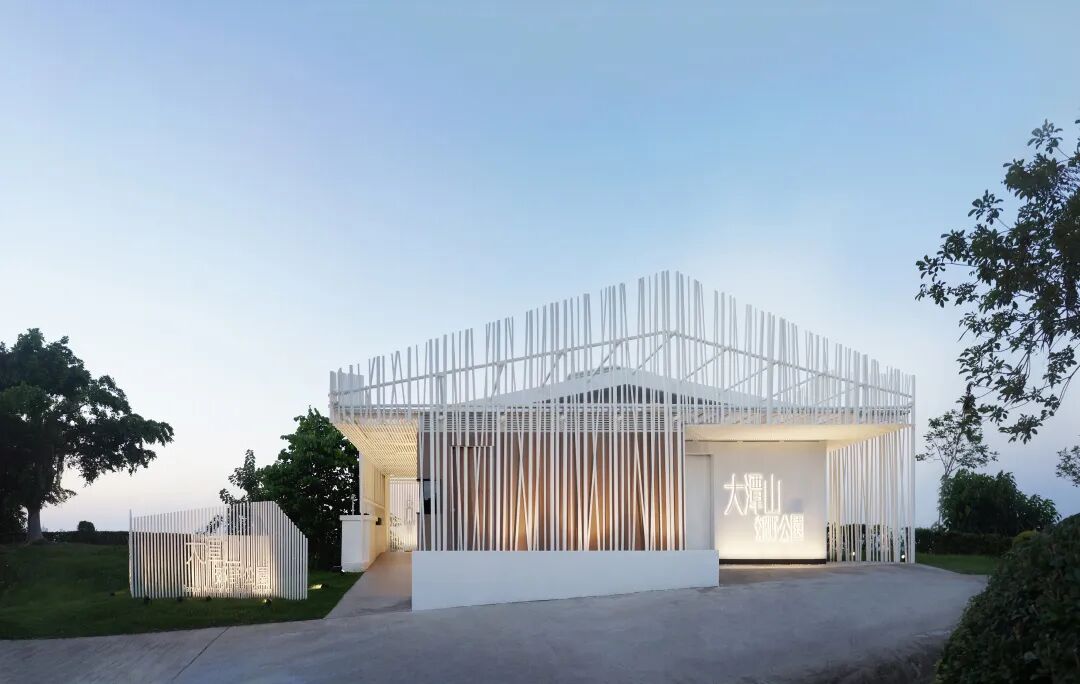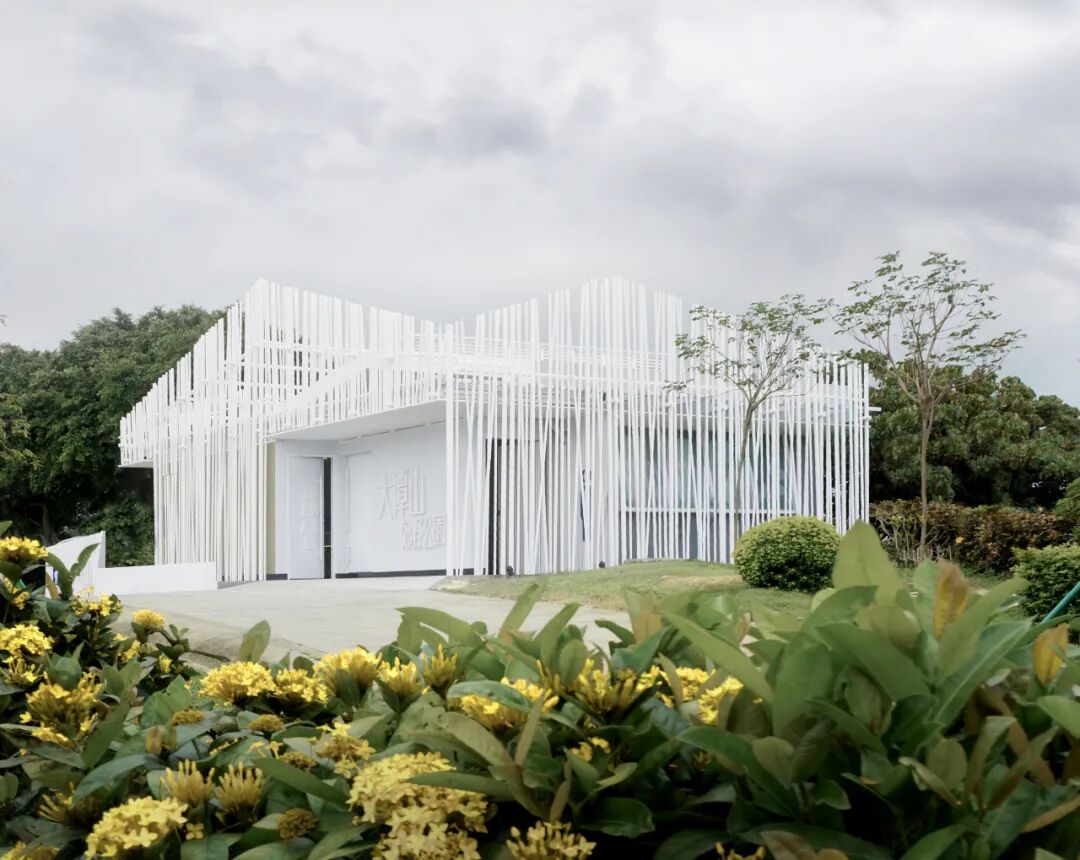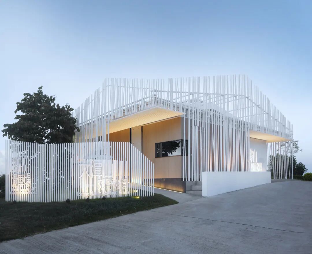 外立面利⽤⽩⾊铝管⾃由交错地排列,以此包围原结构,切割成⼩屋的形态,远看隐约是⼀⽚⽩⾊⽵林,近看则有建筑物隐藏其中。