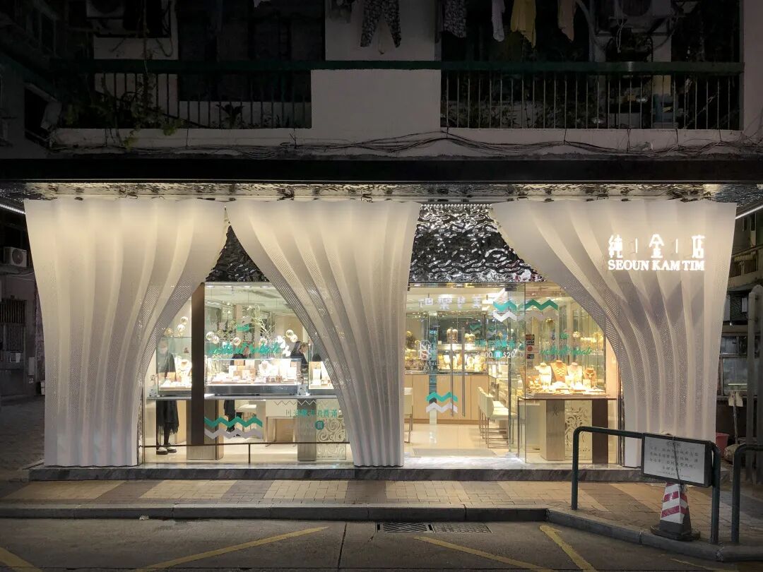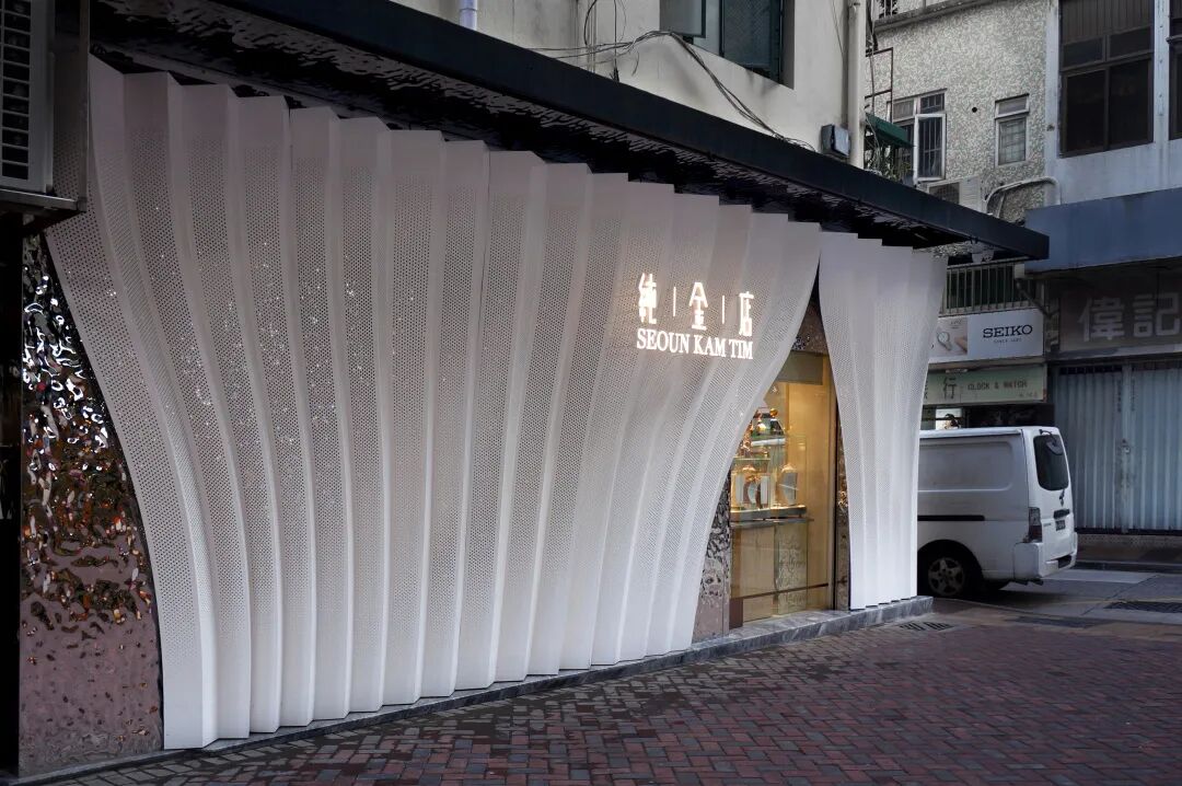 外⽴⾯翻动的曲线⼏何瞬间捕捉了轻纱随风飘动的情景,展现内⾥的⼥⼠⼿饰商品,吸引途⼈的⽬光,停下脚步静观欣赏。设计师希望借新⽴⾯的营造,流露出对澳门城市的情感,绘画出对往⽇的怀念,并同时创造澳门的新⾯貌新形态。