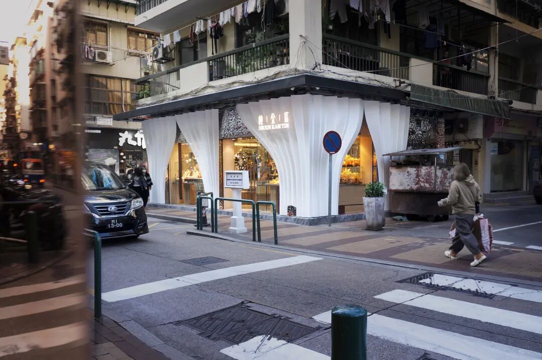 轻纱位于澳门繁忙的旧城区,⼈们熙来攘往,匆忙⽽过。设计师借⽴⾯改造,期盼在密集灰暗的环境点亮新观感,让都市⼈能慢下脚步再⼀次细味旧城区的踪影。