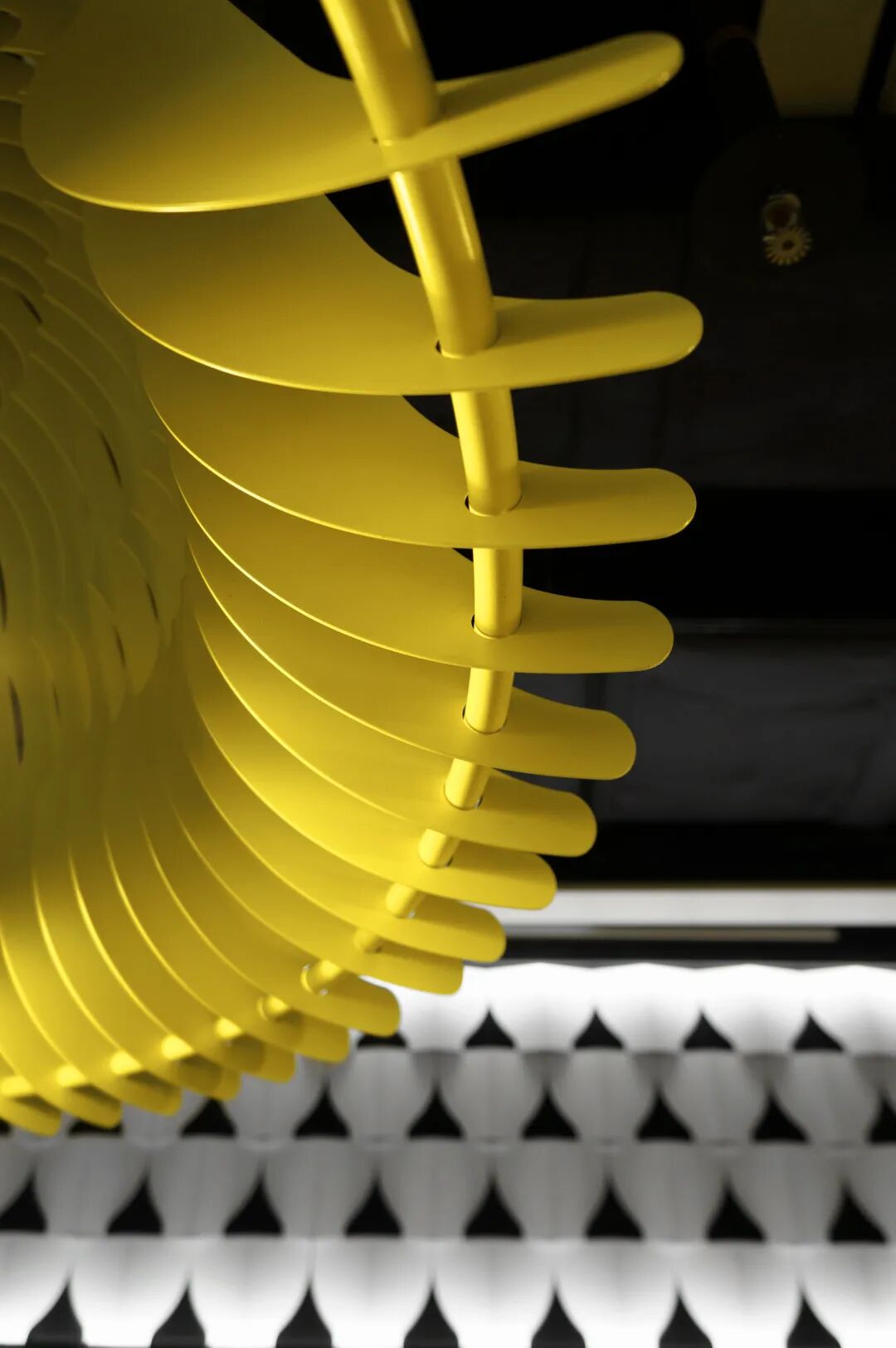反碗被转化为室内空间的⼀⾯⽴体屏风,或许被折垒成⼀幅飘浮的天花,或许被重组成⼀系列的储物架,甚⾄切割重组成⼀排巨型吊灯。