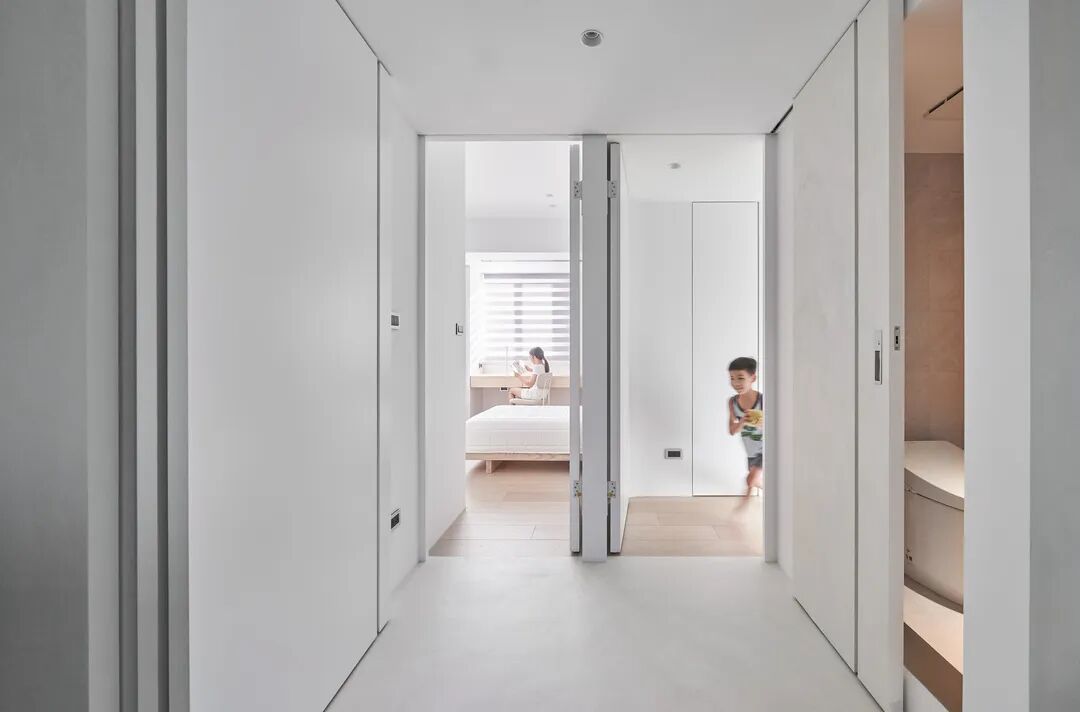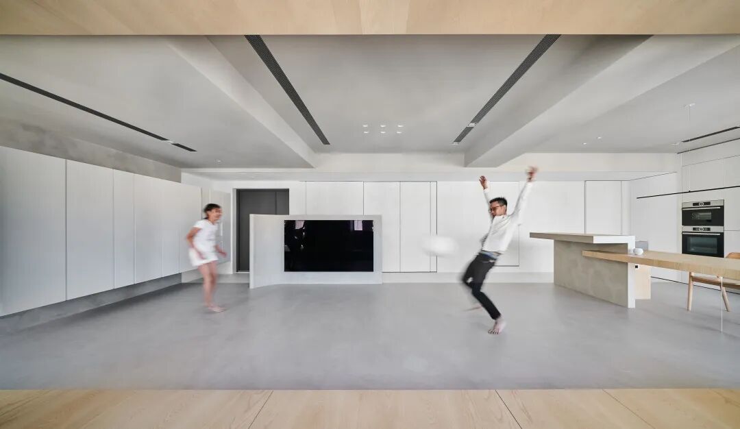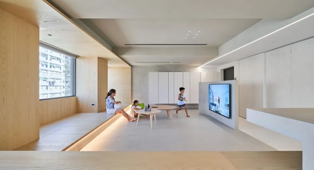这是一个喜欢极简生活的家庭,希望通过简单干净的设计,能够让东西都隐藏起来,全家人可以在极简的空间内分享彼此生活。根据他们的需求,郑明辉先生设想创造一个可开可关的大开放空间,让全家人有一个可以尽情玩乐休息的场域。