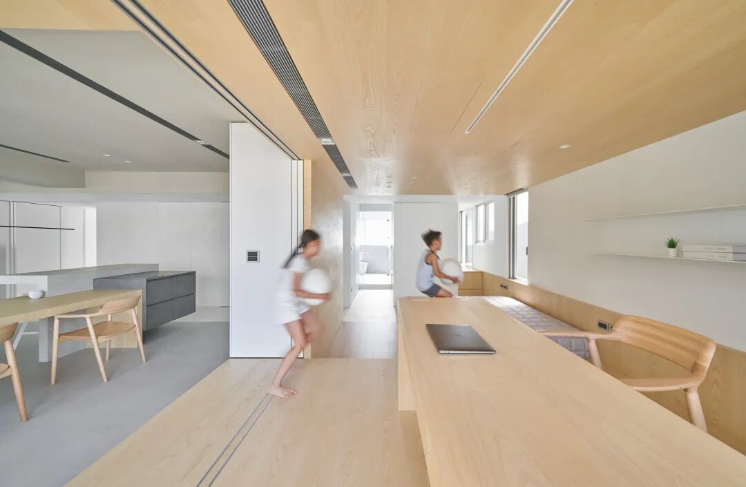 首先,通过平分整个平面配置,将上半部作为主要客餐厅空间,下半部为两间小孩房及厨房跟客浴。其次,让客厅餐厅变成一个大广场,将中岛量体拆解,变成地板延伸上来的吧台,窗边木盒子延伸到主卧书房,平时拉门打开就是家人活动的大平台,主卧与浴室保留一些缝隙让光线也可以在空间中流动。