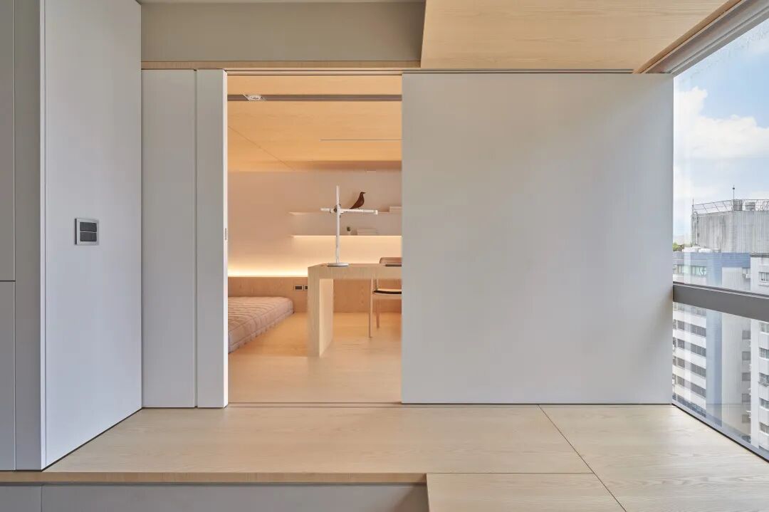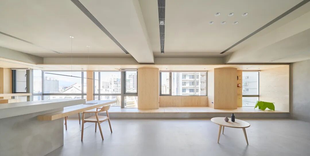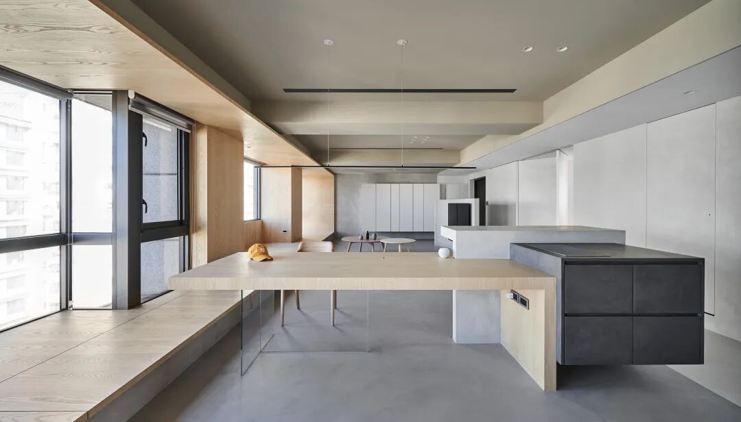 最后所呈现是由三种色块定义的空间形式,白色区块是过道也是进到另一个空间的中介空间,灰色区块是主要客餐厅空间也是家里的大广场,窗边的木盒子是主要收纳空间,也是家中最美的城市框景。