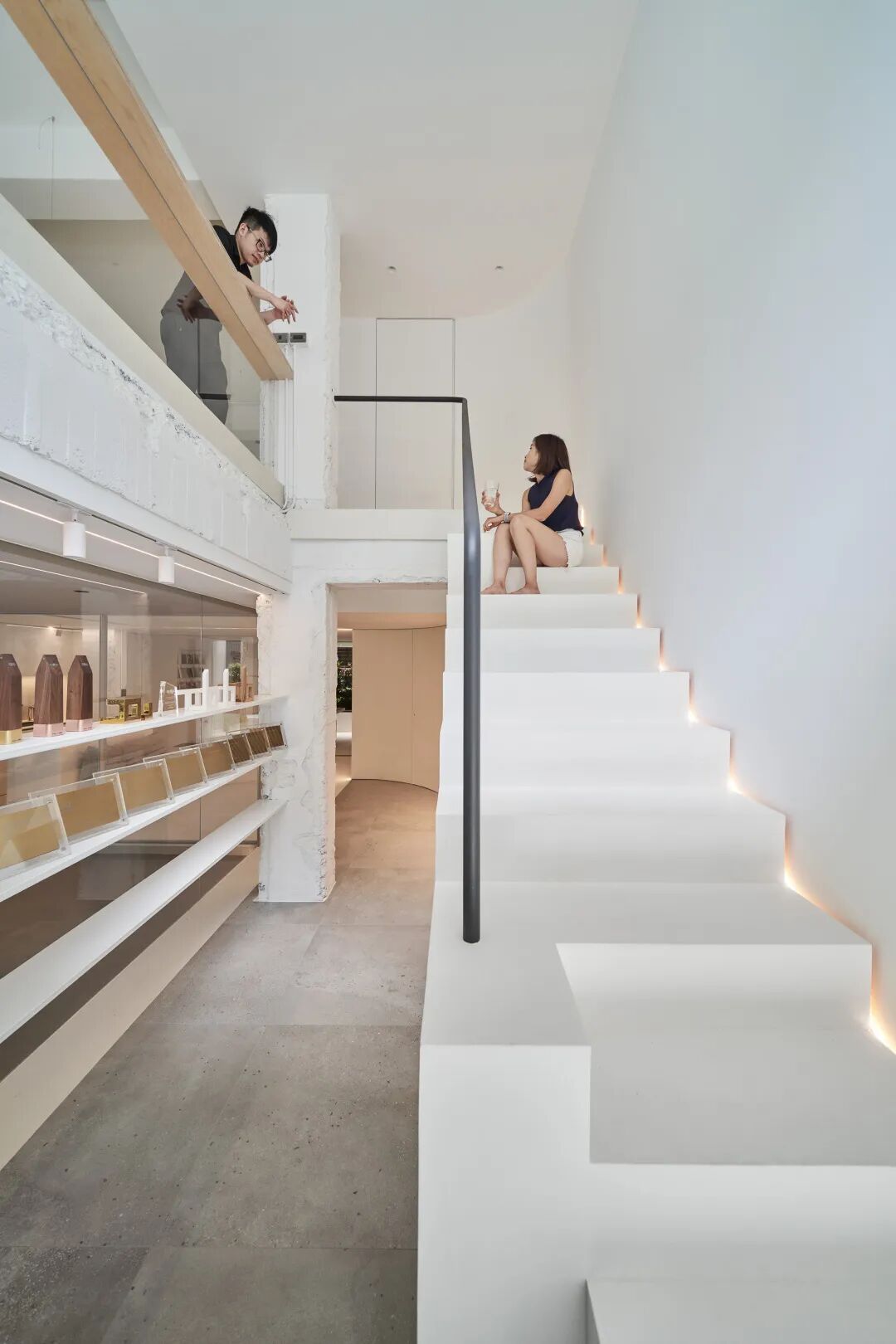 在动线上:将客户与员工的动线分两边,大门进去后,员工可以直接上二楼楼梯,穿越刻意营造的玻璃地板步道,将挑高的视觉感强化。客户则穿越过一道展示挑高的长廊,端景的弧形墙引导客户到后方的绿墙会议室。一楼和二楼分别由客户和员工进行使用,彼此之间存在着不被打扰的动线,但在氛围环境上又达到了和谐统一的观感体验。