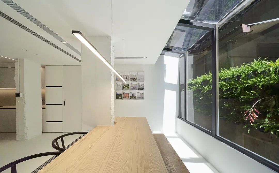 在界面上:一二楼空间创造了五个界面,分别是“一楼入口处退缩形成一个坐的空间”、“一楼内凹的玻璃盒子打造的停车空间”、“一楼会议区外营造的绿墙”、“积木楼梯过道”和“二楼白色盒子阳台”。这五个界面,共同组成了虫点子3.0办公室,通过设计抛开冗余的装饰堆砌,注重环境与人的贯通尺度,以简单朴素的语言和线条的利落去构建空间秩序。