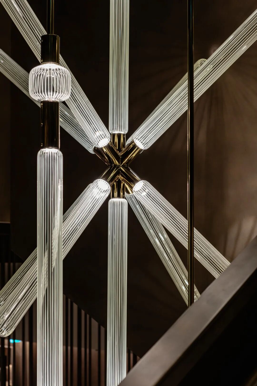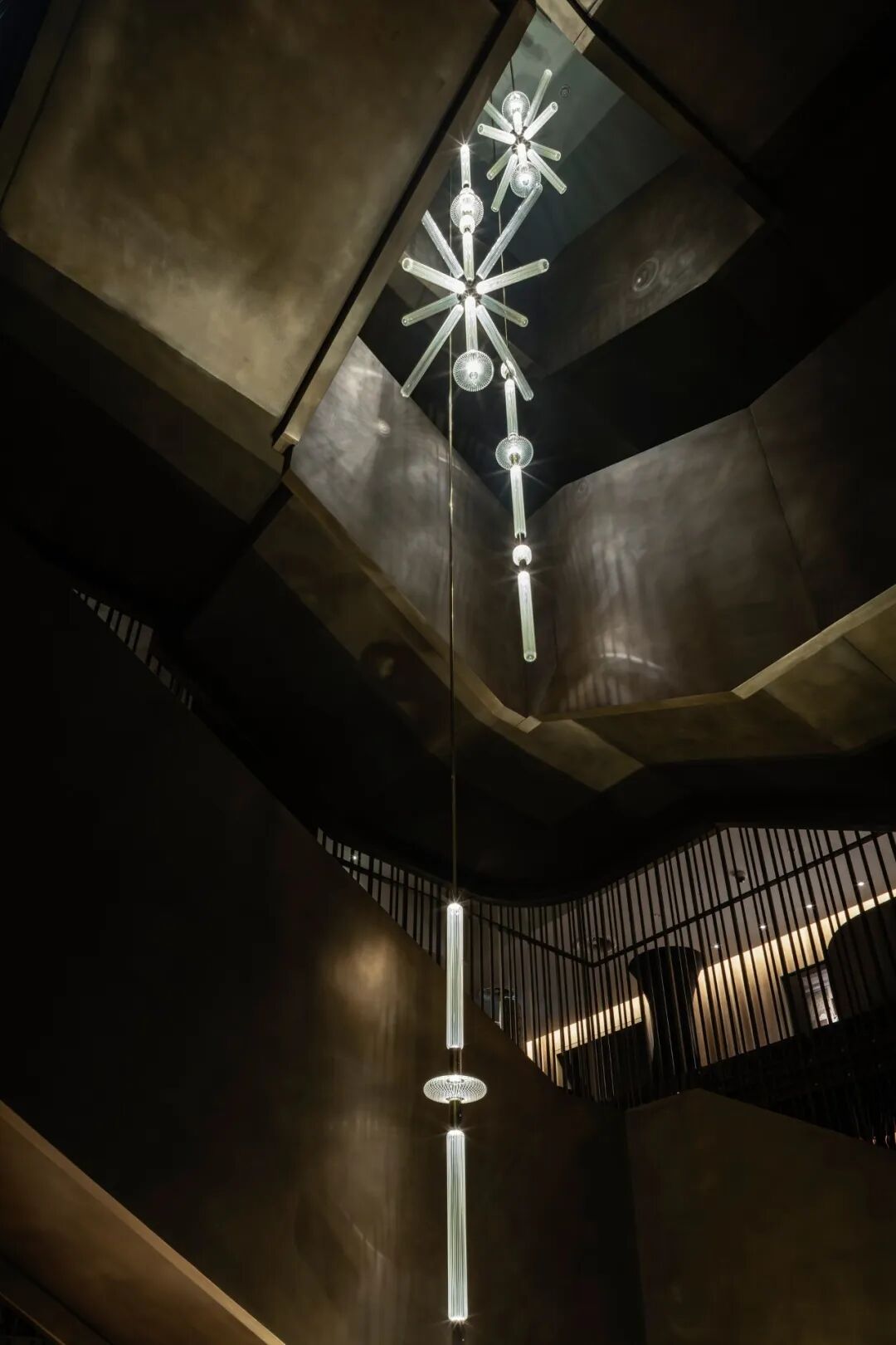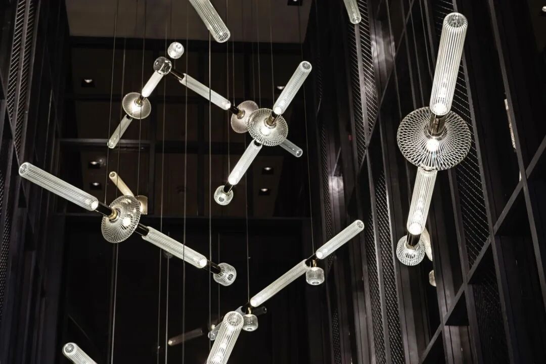 A:格伦:是的,我们在自己的项目中当然使用了我们设计的产品,它满足了我们各个场景下对灯光的需求,同时保证了新鲜感和新奇感。在今年秋天英国伦敦莱斯特广场落成的Londoner(伦敦人)酒店项目中, Cipher(“密文”)像一个前卫的装置艺术一般,水平地漂浮在酒店入口处的迎宾吧台上方。最壮观的场景是酒店内向地下延伸三层的旋转楼梯中,每一层都有一个灯光构成的“星爆”在空间绽放。它们在每个空间中都让人感到很自然舒适,同时仍然能保持它独特的辨识度。Cipher(“密文”)在Londoner酒店项目中展现出的感觉与它摆放在我纽约公寓书桌上带给我的感觉如出一辙:自然。