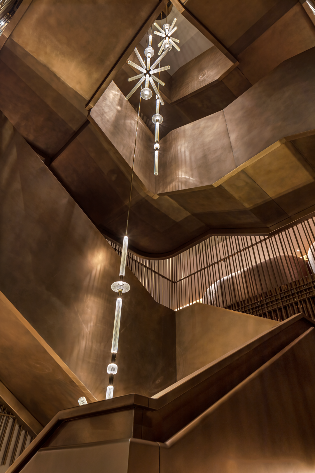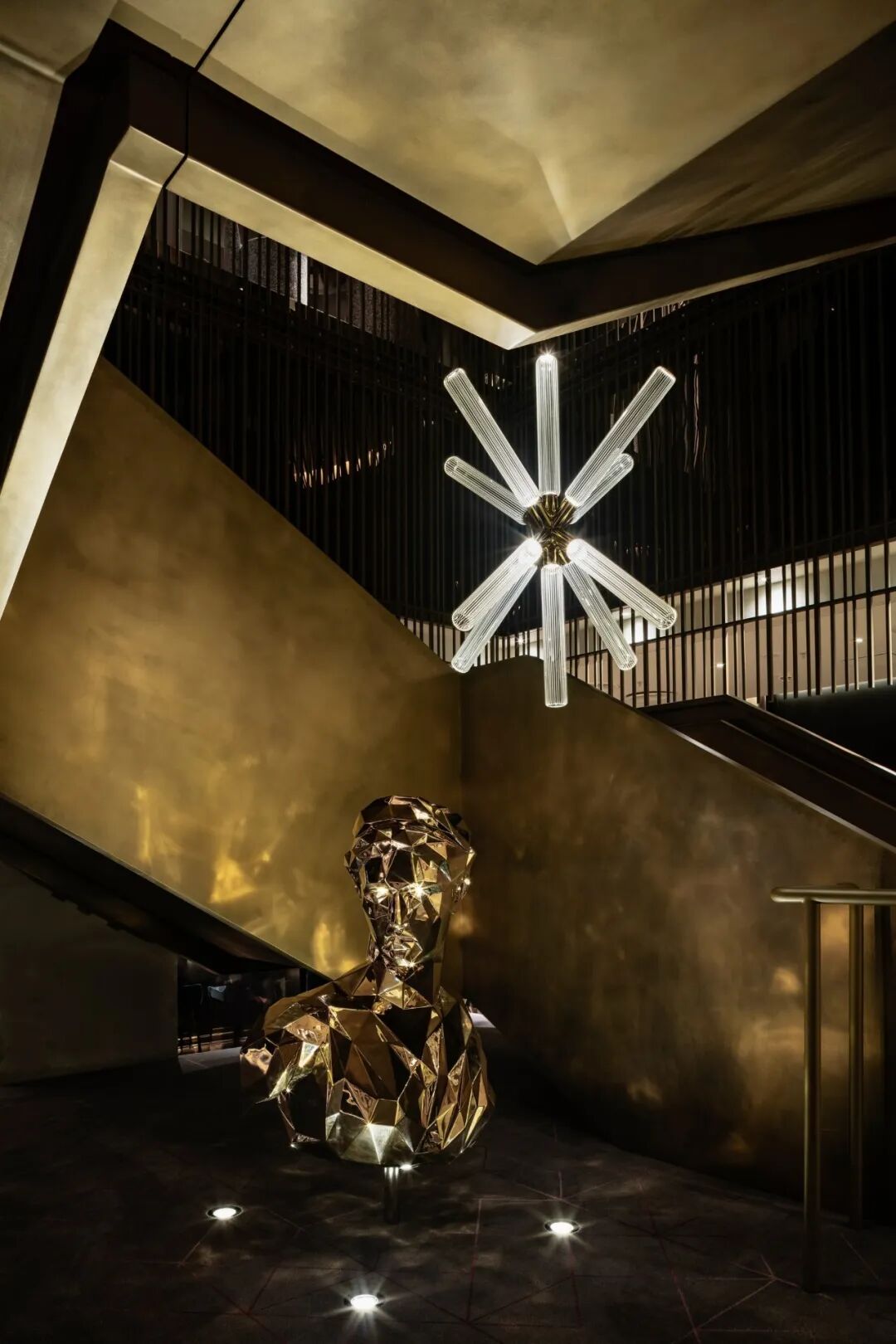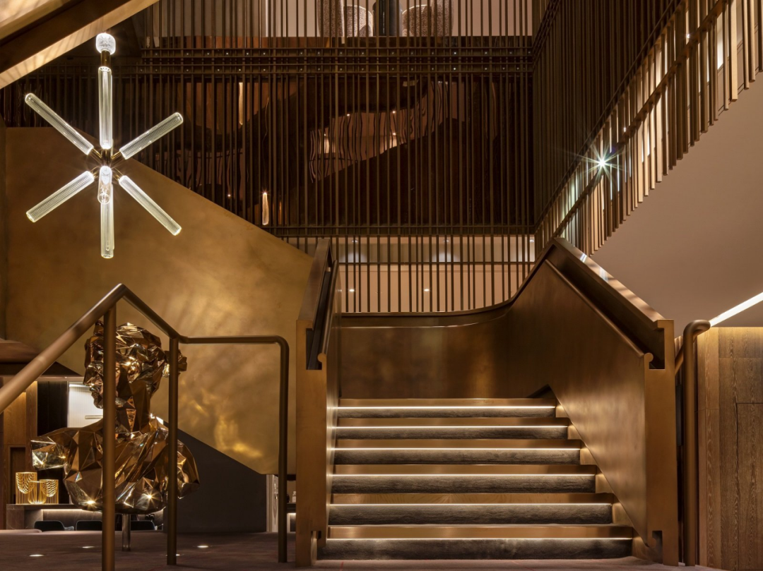 A:格伦:是的,我们在自己的项目中当然使用了我们设计的产品,它满足了我们各个场景下对灯光的需求,同时保证了新鲜感和新奇感。在今年秋天英国伦敦莱斯特广场落成的Londoner(伦敦人)酒店项目中, Cipher(“密文”)像一个前卫的装置艺术一般,水平地漂浮在酒店入口处的迎宾吧台上方。最壮观的场景是酒店内向地下延伸三层的旋转楼梯中,每一层都有一个灯光构成的“星爆”在空间绽放。它们在每个空间中都让人感到很自然舒适,同时仍然能保持它独特的辨识度。Cipher(“密文”)在Londoner酒店项目中展现出的感觉与它摆放在我纽约公寓书桌上带给我的感觉如出一辙:自然。