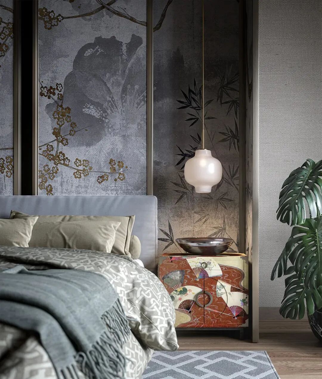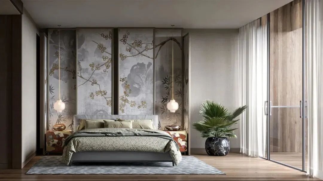 The saturation that also chooses in the bedroom is relatively low tone, the ink painting of the head of a bed creates the cultural and artistic atmosphere in the space. Add small ornament again, let whole space become more delicate literature and art.