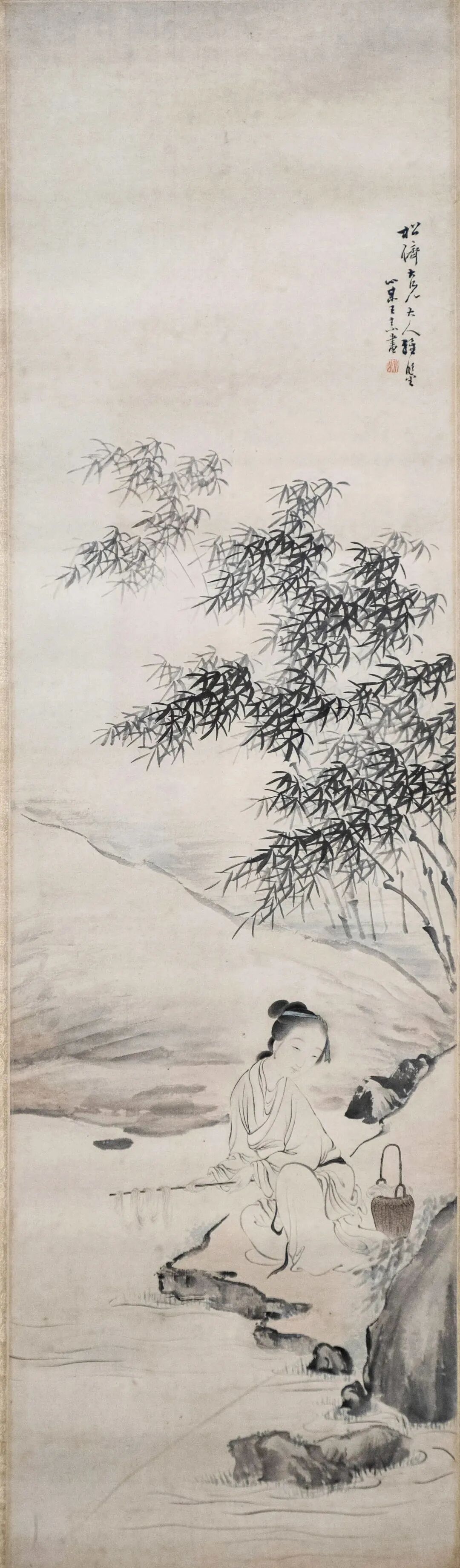 仕女画是传统人物画中的重要的题材,主要表现上层仕女生活。到了清代,仕女画受各阶层的追捧,无论在创作题材上,还是艺术表现形式上,都具有显著的时代特征,充分体现出了清代的艺术审美观,偏向世俗生活。王素《竹溪浣纱图》,就是一幅非常经典的仕女画作品。