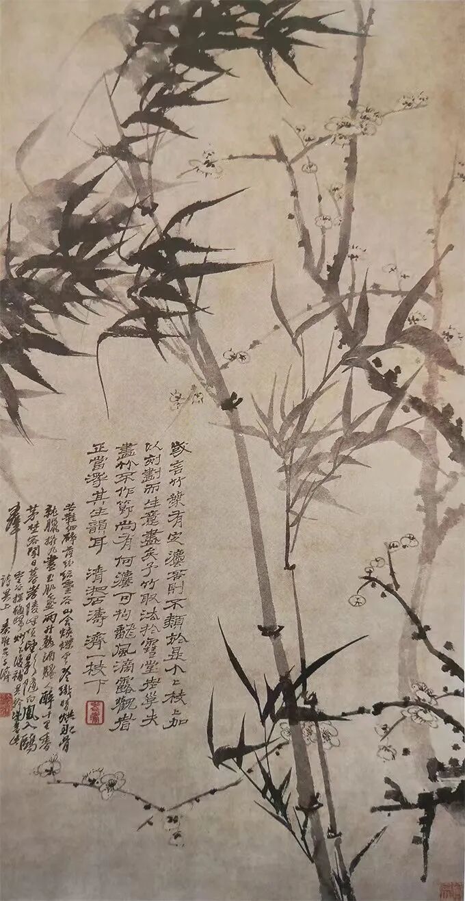 这幅作品是石涛传世墨梅和墨竹的上品之作,写有两部分题款。其中一段为 “芒鞋细碎落纷纭,灵谷山含蛱蝶云。冷织晴烘水骨就,腊催寒尽玉肌氲。两升热酒骚人醉,口里香茅野客闻。日暮孝陵峰顶望,影随白凤入鸥群”。