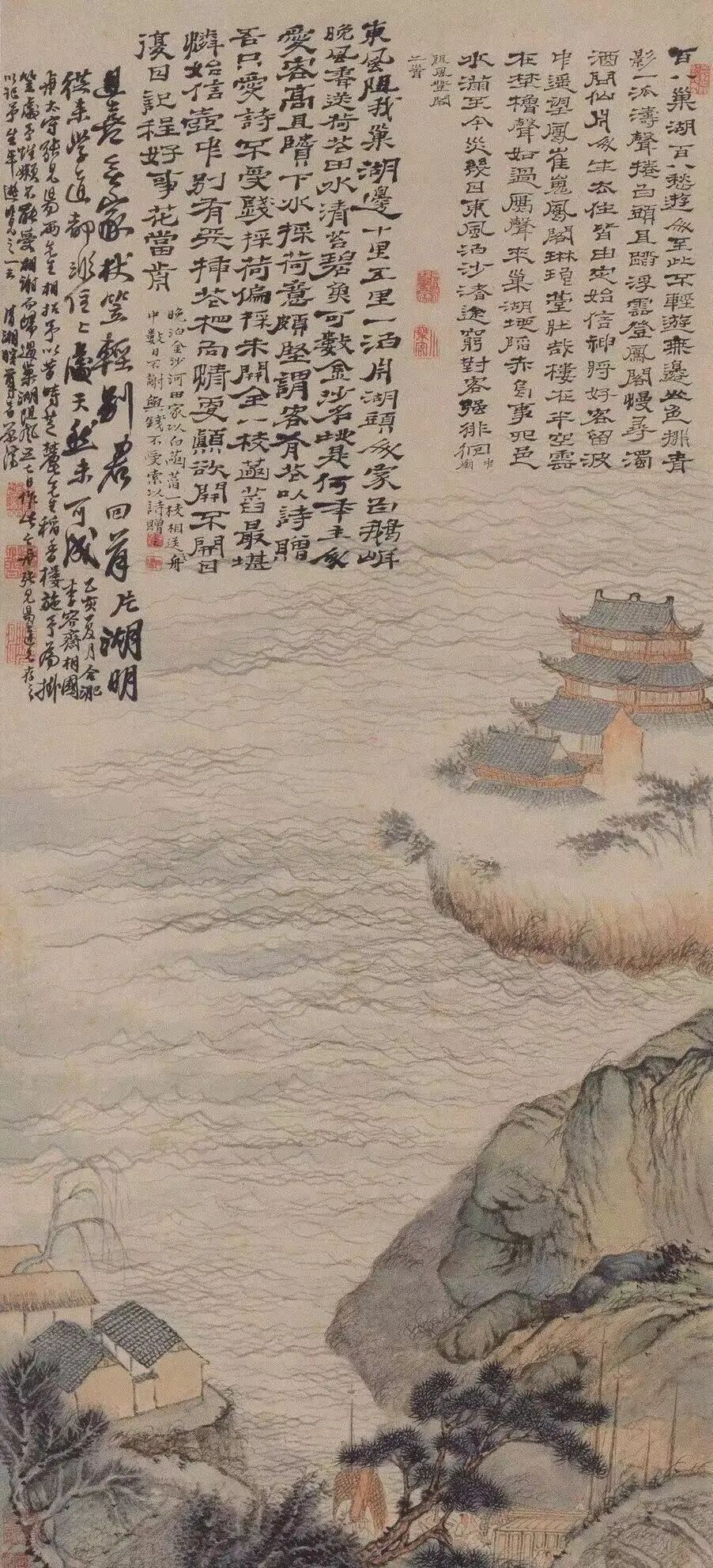 石涛53岁时,应吏部尚书、英武殿大学士李天馥和庐州府太守张见易的邀请,从扬州到庐州游览,返回扬州路过巢湖,巧遇下雨发大水,于是创作了《巢湖图》。