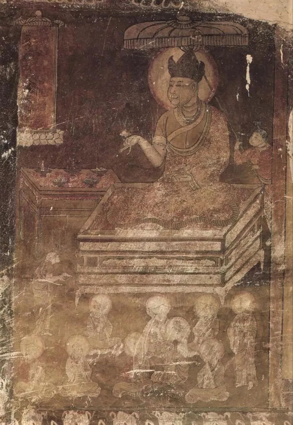前面我跟大家讲到了,在它的西壁,也就是说你进门看到的这一壁上头,我们看到了一个西夏的国师,西夏的国师叫惜毕智海,是一个党项族的高僧,他正在主持举办这样一个烧施供养仪式。