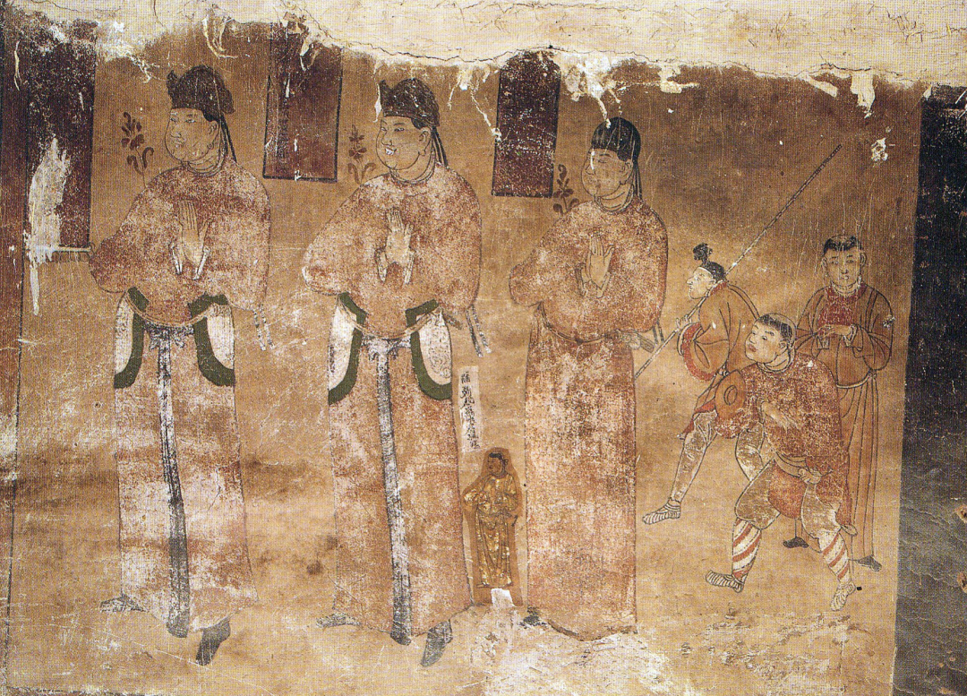 但是它有很强的官府性质,因为这里头的西夏武官,西夏当时的官员是文武都在一起,就像是总督一样,既是最高的军事长官,同时又是最高的行政长官,它是军政一体的。在这里的话,我们就看见这个窟它有很明显的官府特征,而且有一个有趣的现象就是这些当然官员他们都要戴冠、穿着铠甲,就是官服呗。他们后面跟着的仆人有一些teenagers,也就是半大的孩子,这些孩子他们的头形都是髡发「词条2」的。什么叫髡发?就是把头顶中心刮掉一块,其它地方两边周围还有点儿头发,络绎说这种中间刮掉一块的这种方式就叫髡发。这是在西夏时候施行的一个法律,就是所有的男性他都要髡发,要把中间刮掉,这个是西夏时期的壁画人物当中的一个特点。