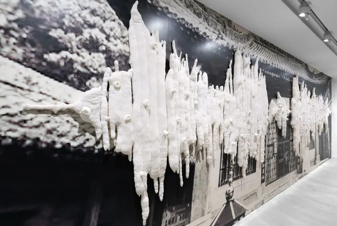 艺术家标志性的衣物碎片在波纹的缝隙中钻出,这些被一个个具体的人穿着过的衣物在更加漫长的时间跨度内发生变化,将衣物主人的生命经历忠实记录在纤维表面,与瓷互为参照,引领观者进入对生命境况的沉思中。