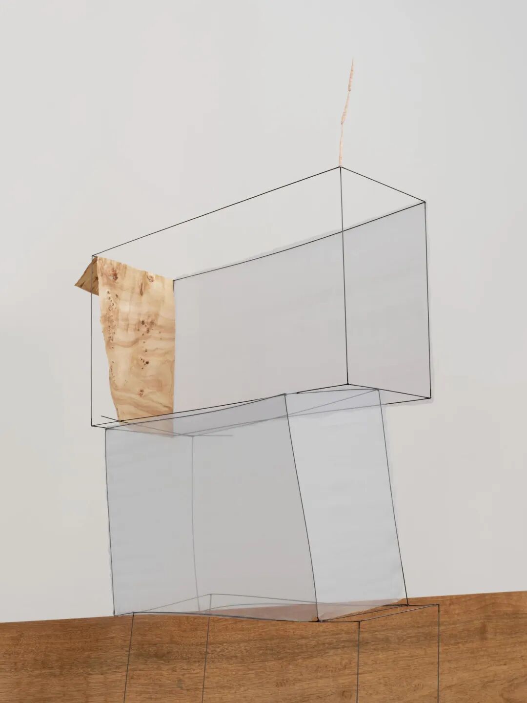 整个展场,给人最大的感受是艺术家对于材料的运用,珊瑚石、绡、墨、线、铁丝、纱布、太空铝板甚至是蜜蜂的蜂巢,比如作品《通幽处无》系列起于艺术家最近在家中阳台里用45x16x25cm的狭小木蜂箱,豢养5000只蜂群的一段经历。日日调两勺蜜水就打发一城夏蜂的世世代代的“此生”。曲径是没有的,通幽也自然也就不必了。这些作品在艺术家的手中变为作品,可以从中感受到克制与感性,尖锐与温柔,生物性与没有生命的物体,脆弱与坚固,短暂与永恒。