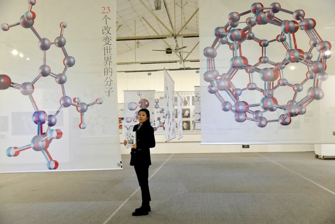 展览呈现了23个改变世界的分子结构图,其中包括富勒巴克球、反应停、青霉素、吗啡、阿司匹林等23个分子图,每一张分子图下面都有一个二维码,我们用手机扫描这个二维码,就可以看到每一个分子的运动轨迹和详细的介绍。另外,观众可以戴上3D眼镜来感受每一个分子图的立体效果,给观众带来了更加多元化的视觉体验。