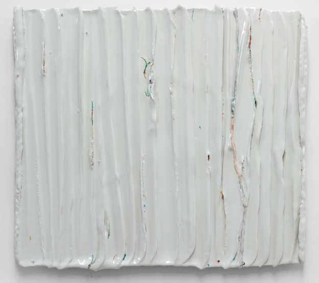 衣服和瓷器是尹秀珍惯常使用的材料。此次展出的全新作品系列“沧浪志”选取了瓷为主要材料,并将艺术家与瓷土的关系推进到更具身体性的层面上。通过手部或强力或轻柔的推挤,艺术家在厚重的瓷板表面留下肉身一样的褶皱与波纹。