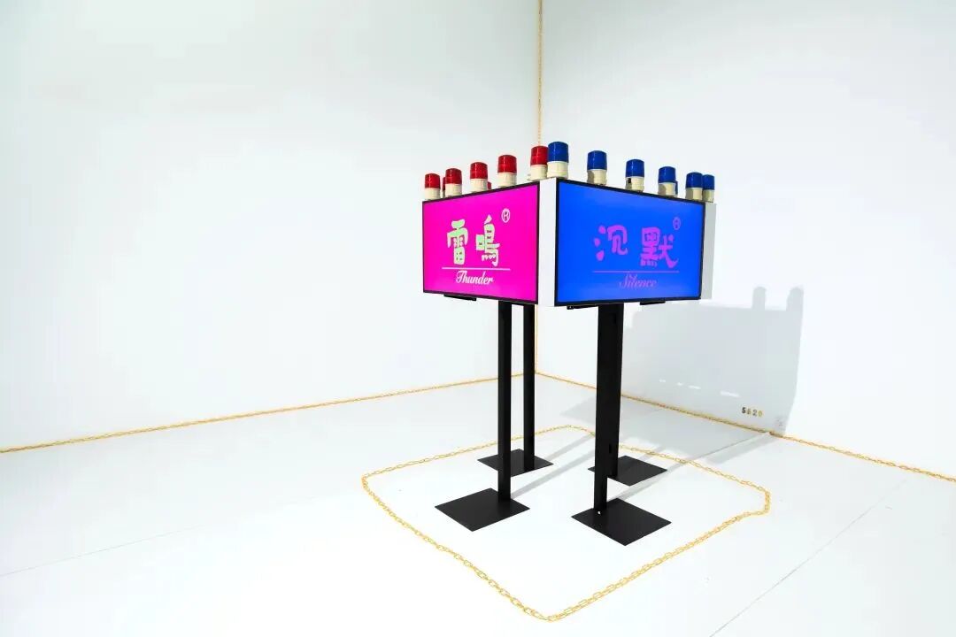 张小涛作品《雷鸣·沉默》,他将“雷鸣、沉默”二个关键词提示出来,并做成广告灯箱的LOGO,既是我们面对公共事件的态度与立场,又是语义,图像、色彩装置的一种焦躁不安的心理暗示。