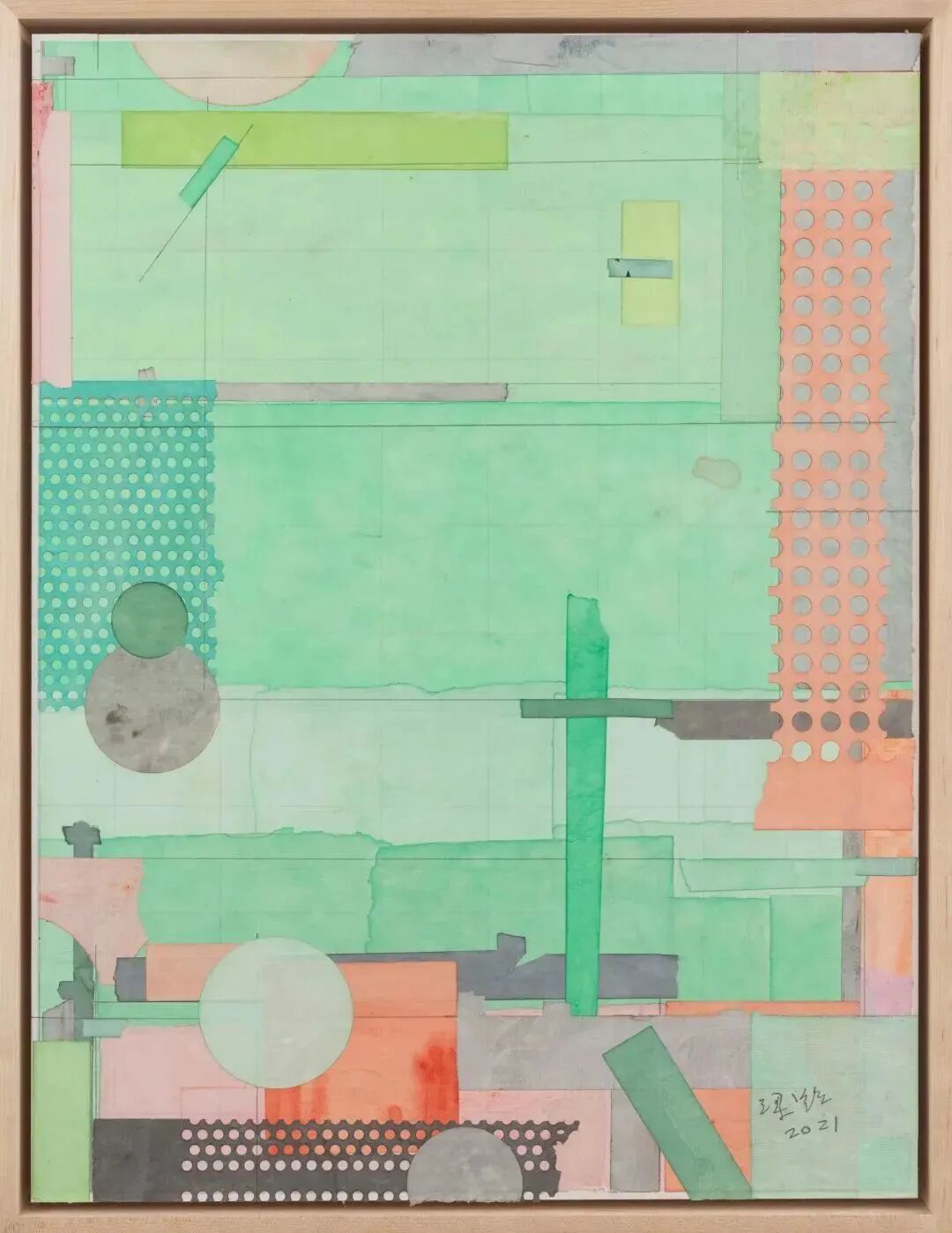 在他今年的新作中,艺术家将购自民间文物交易平台的古代瓷器碎片在特定的视觉规律下排列,在和谐而令人愉悦的色彩与几何构成中,“瓷”自身的社会属性被暂时剥离,瓷片只安静地落于画布之上,向观者显现物的本源状态。