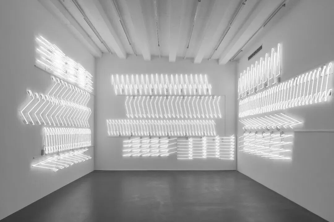 霓虹装置《扭曲 II》(2020-2022,白色霓虹灯管,变压器,400 x 560 x 600 cm,装置尺寸可变),艺术家通过截取和提炼当代景观的图像和造型,一方面强化了塑造当代心理的物质形式,与此同时,这些去功能化的日常废弃材料也被残酷地孤立为兼具多重矛盾的当代遗迹。作品生产所需要的高强度劳动,在白盒子里“复原”材料成为实践的重点,也成为反思社区、城市与事件间紧张关系的起点。