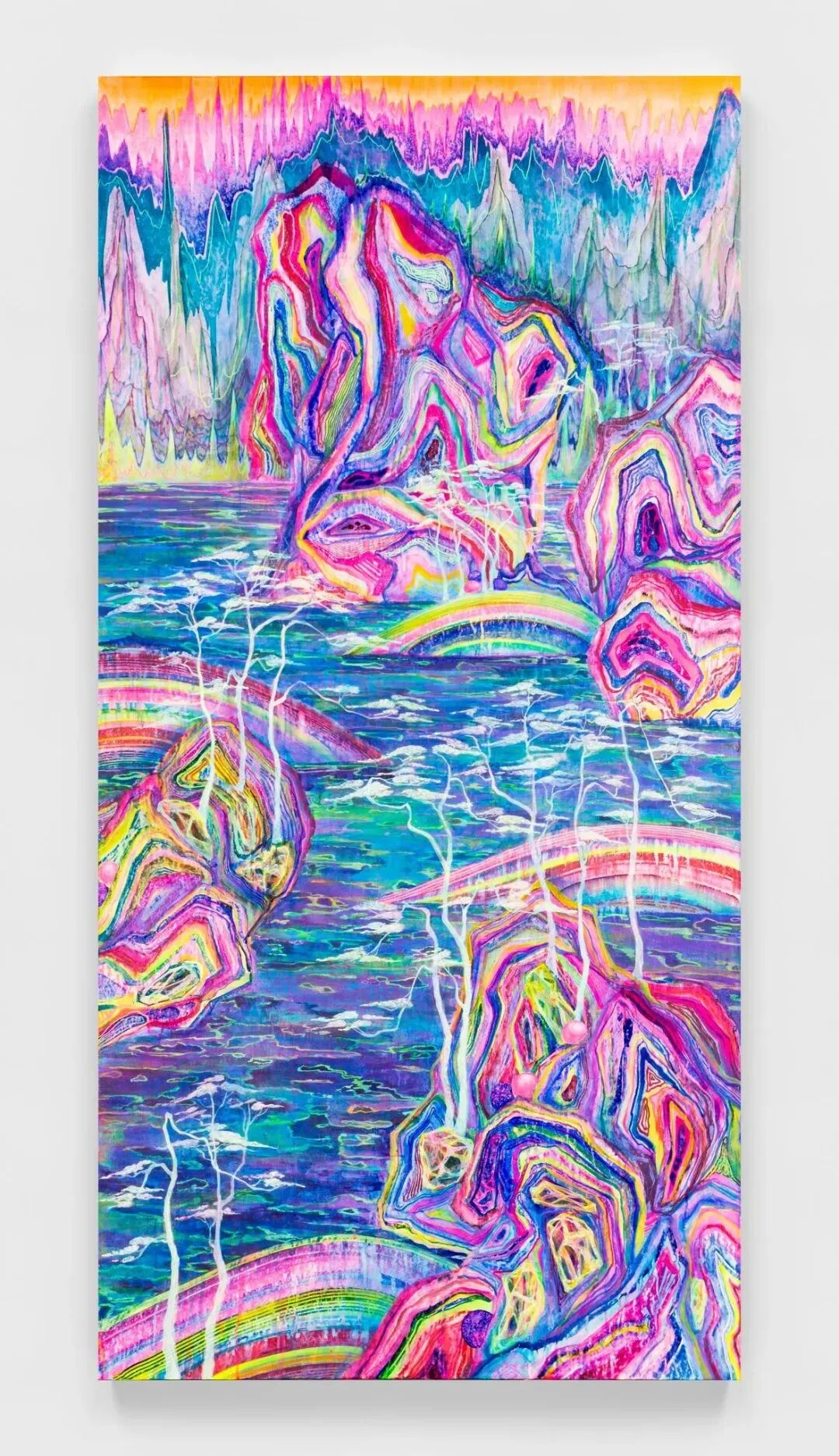 新作延续了黄宇兴以往画面中绚丽的荧光色彩,但在线条和造型上却做了一些拓展——电波般蜿蜒的能量线,多个人头及骷髅般的身体,放射着耀眼能量和光芒的球体,共同构成一个翻腾着的银河系,充满荒诞和科技感。在新作中,黄宇兴书写着自我对宇宙及现实生活的思考。