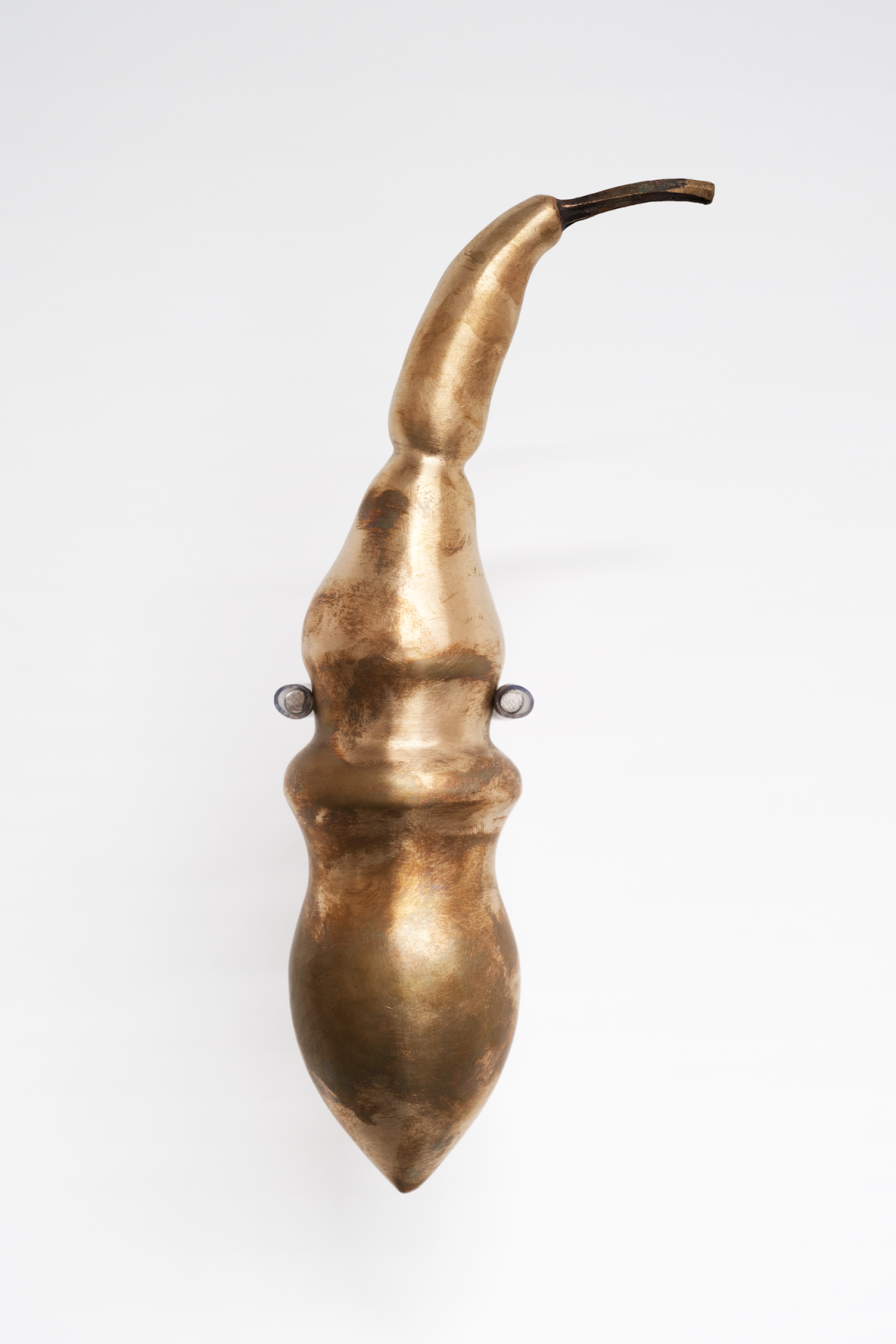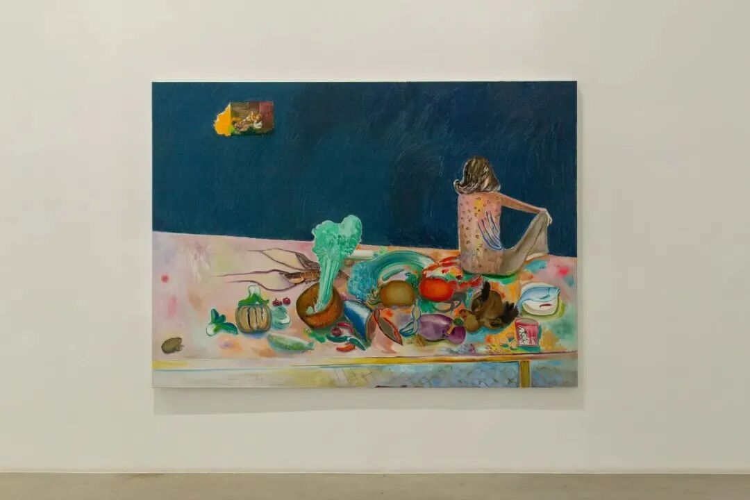 始于对日常现实场景的再现,段建宇在画面叙述的过程中渐渐滑入意识的世界。在新作自画像系列《餐桌(正面)》(2021)、《餐桌(背面)》(2022)中,艺术家用极具个人形象符号的方式将自己呈现出来,《正面》中的她神情自若,与一尊尊如供品般整齐排列的瓜果造像们并肩而坐,隐隐散发着一种佛性光辉。蔬菜瓜果似乎各自为政,又具备着一种模糊的集体身份,唤起观者思考物我之间、个体和周围世界之间微妙的联结关系。