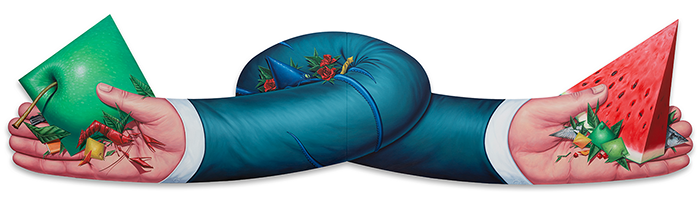 在周松看来,膨胀,既是宇宙演进的规律,也是生命体得以存续、进化的动力。恰如宇宙无限膨胀的演进过程,人类作为宇宙的一部分,同样倾向于将质量和能量转化为发展、进步以及自我表达的过程。同时,通过将水果、植物和动物构绘成抽象、二维的几何形状,而非原本完整、立体的有机物状,周松既传达出人类改造基因、改造自然的强烈欲望,也鼓励观众想象人类与自然相互塑造的各种方式,以及人类演化进程中所孕育的诸多可能。