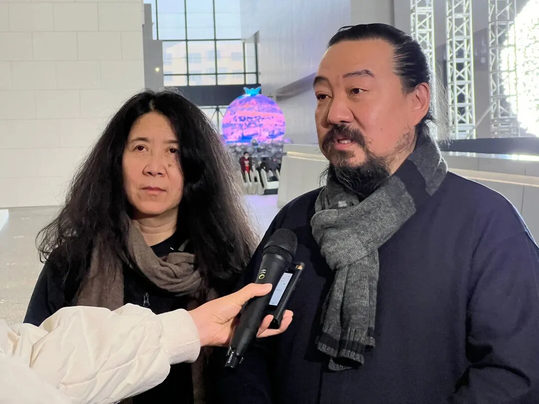 ▲艺术家宋冬(右)和尹秀珍(左)在展览现场