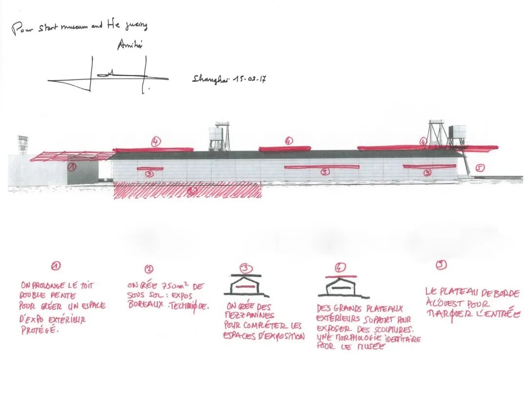 为了说服让·努维尔先生,我在第一次见面时讲了五个理由:一、这里曾是中国末代王朝建立的火车站,蕴含着中国人对现代社会和工业时代的憧憬;二、战争时期,这里被外国炮舰占领,被轰炸威胁,见证了动荡与坚韧;三、水路与陆路运输相接,曾是煤炭等物资的运输枢纽,也代表人们有关出走与回归的愿望;四、沿岸面江100米,自然与人文环境宜人;五、我希望打造一个具有国际视野和影响力的美术馆。听完这番话,他欣然同意合作。后来我们再去尼斯拜访他,讨论建筑构想的时候,他一边听我说,一边兴奋地亲手画起设计图来,建筑的雏形就此诞生。