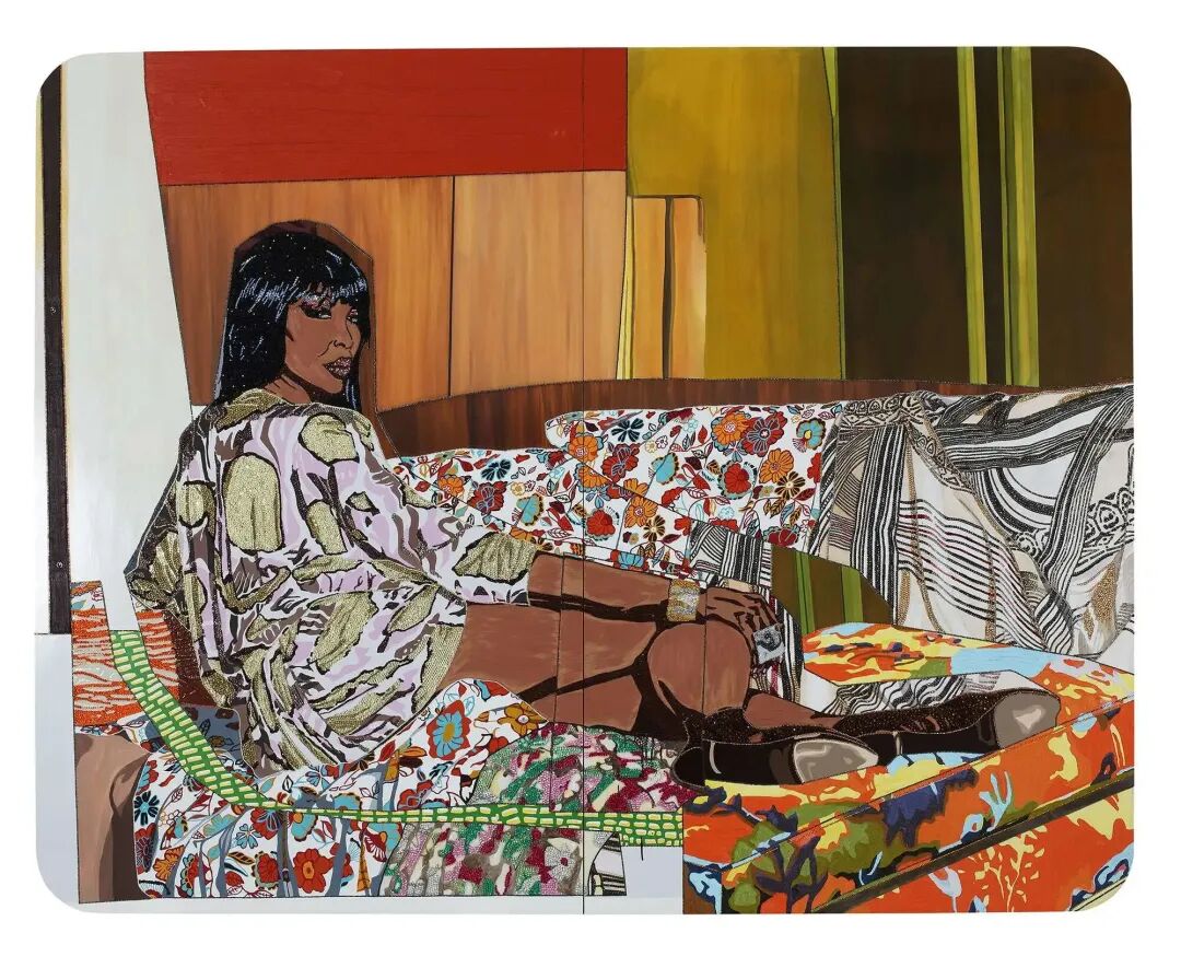 ▲《目视前方的娜奥米》_ 马克琳娜·托马斯Mickalene Thomas _ 木板上油彩、珐琅、莱茵石、丙烯_ 243.8 x 304.8 cm _ 2013