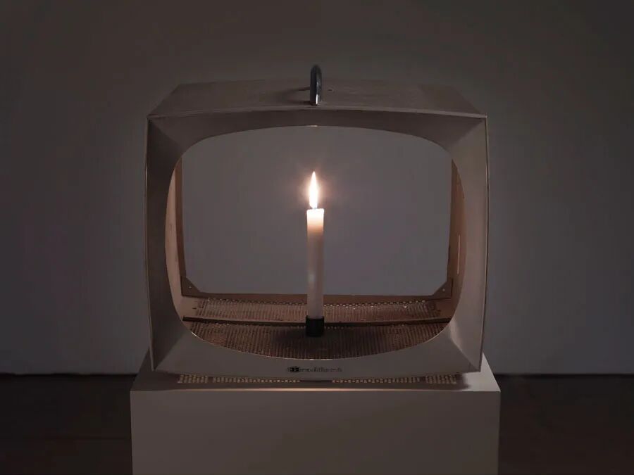 ▲《蜡烛电视》_ 白南准Nam June Paik_ 老式金属电视机壳上马克笔,内置点亮的蜡烛_ 38.1 x 41.6 x 37.8 cm _ 1991