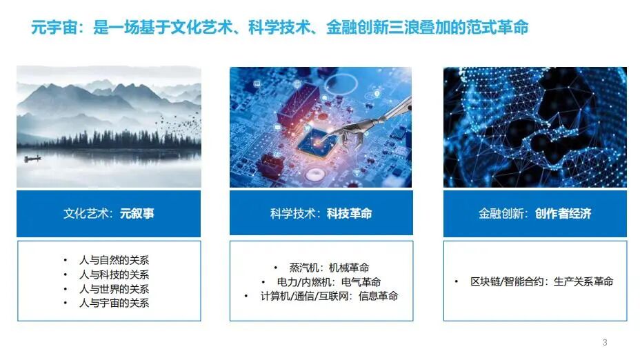 因此,元宇宙不等同于Web3.0、数字藏品、NFT等,而是一场基于科技 + 文化 + 金融,三浪叠加的范式革命。