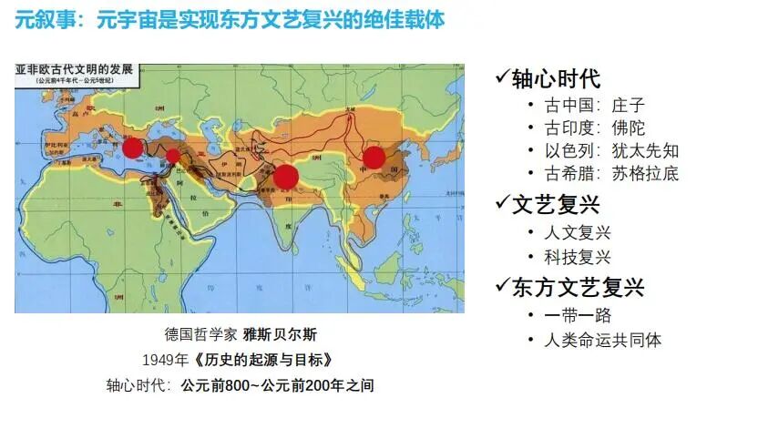 蒋子俊更具体的谈到,元叙事上面来说,元宇宙是实现东方文艺复兴的绝佳载体。1949年,德国哲学家雅斯贝尔斯在《历史的起源与目标》提到轴心时代(公元前800-公元前200年之间),那是人类历史上思想最光辉的时代,比如:古中国(春秋战国)、古希腊(古典时代)、古印度(佛陀时代)、以色列(犹太先知);之后的每次人类的重大发展,都需要回望轴心时代去吸取营养,比如文艺复兴、科技革命等等。