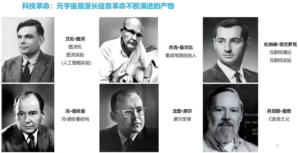 从科技方面来讲,元宇宙也不是昙花一现,去年或者前年才开始的,是一个漫长的信息革命不断演进的产物,艾伦·图灵的图灵实验,伦纳德·克兰罗克的互联网理论与互联网实验,冯·诺依曼的计算机体系结构,戈登·摩尔的摩尔定律,丹尼斯·里奇的C语言等等,正是因为有了计算机的基础设施建设发展,才催化出元宇宙的出现发展。