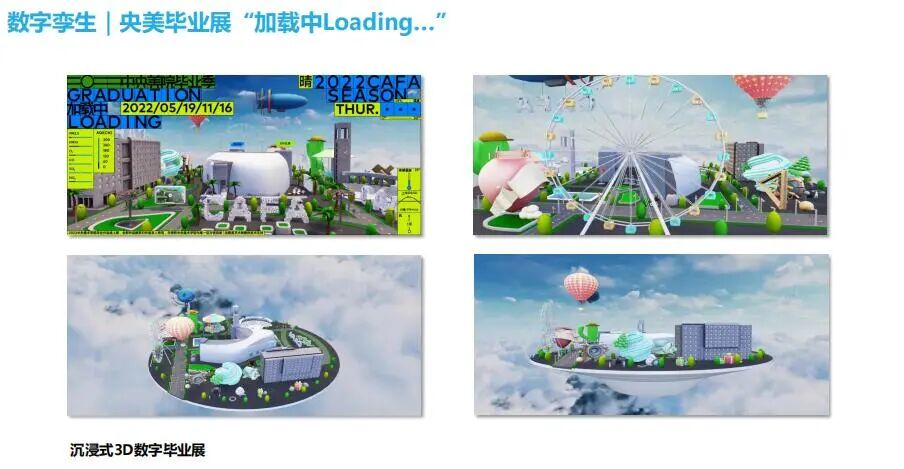 首先数字孪生部分,雅昌在去年作了众多实践,比如“央美毕业展‘加载中Loading…’”,这是一场沉浸式3D数字毕业展,大学四年,同学们有三年的时间都在网课中度过,中央美术学院年度毕业季以“加载中Loading…”为主题,用“线上大展厅”来呈现毕业创作。同时,“中央美院数字孪生校园”呈现沉浸式3D数字虚拟景观,还原复现中央美术学院的经典元素。