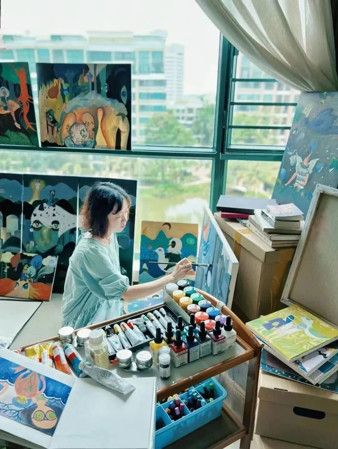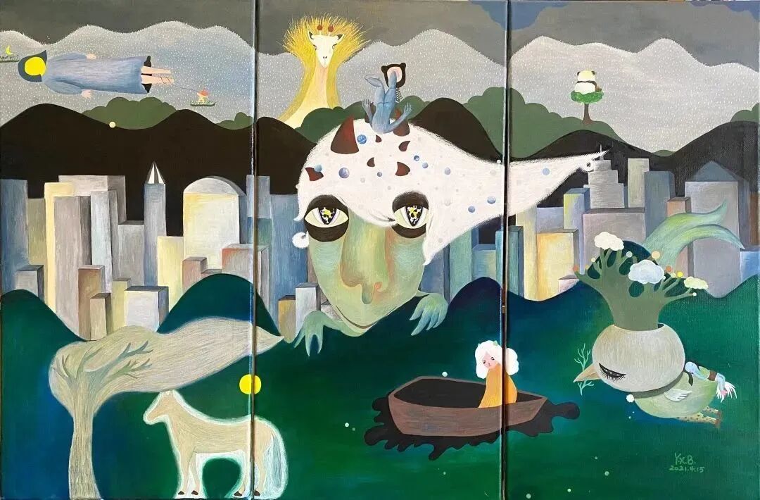 创作理念:我在我的作品中构筑起了一个奇幻乐园,在这个世界里,动物们可以肆意而行,鱼长出了双脚,人在天上飞,大树生长在云上,一切看起来都是荒诞而不合逻辑的,却非常融洽而自然。它们不是乌托邦,充其量只是一个个五彩斑斓的肥皂泡。作品里的“它们”有着自己独特的时间与空间氛围,这里面当然有博斯、基里科、达利等诸多西方艺术大师的影响,另一方面村上春树的小说是我另一个灵感的来源,比如说他在作品里多次提到的“出口”与“入口”,就是类似于一种超时空的“场”,而这些理念与我的创作是有不谋而合的地方。我把这些独特的时空观贯彻到作品中,它是我作品的内核所在。