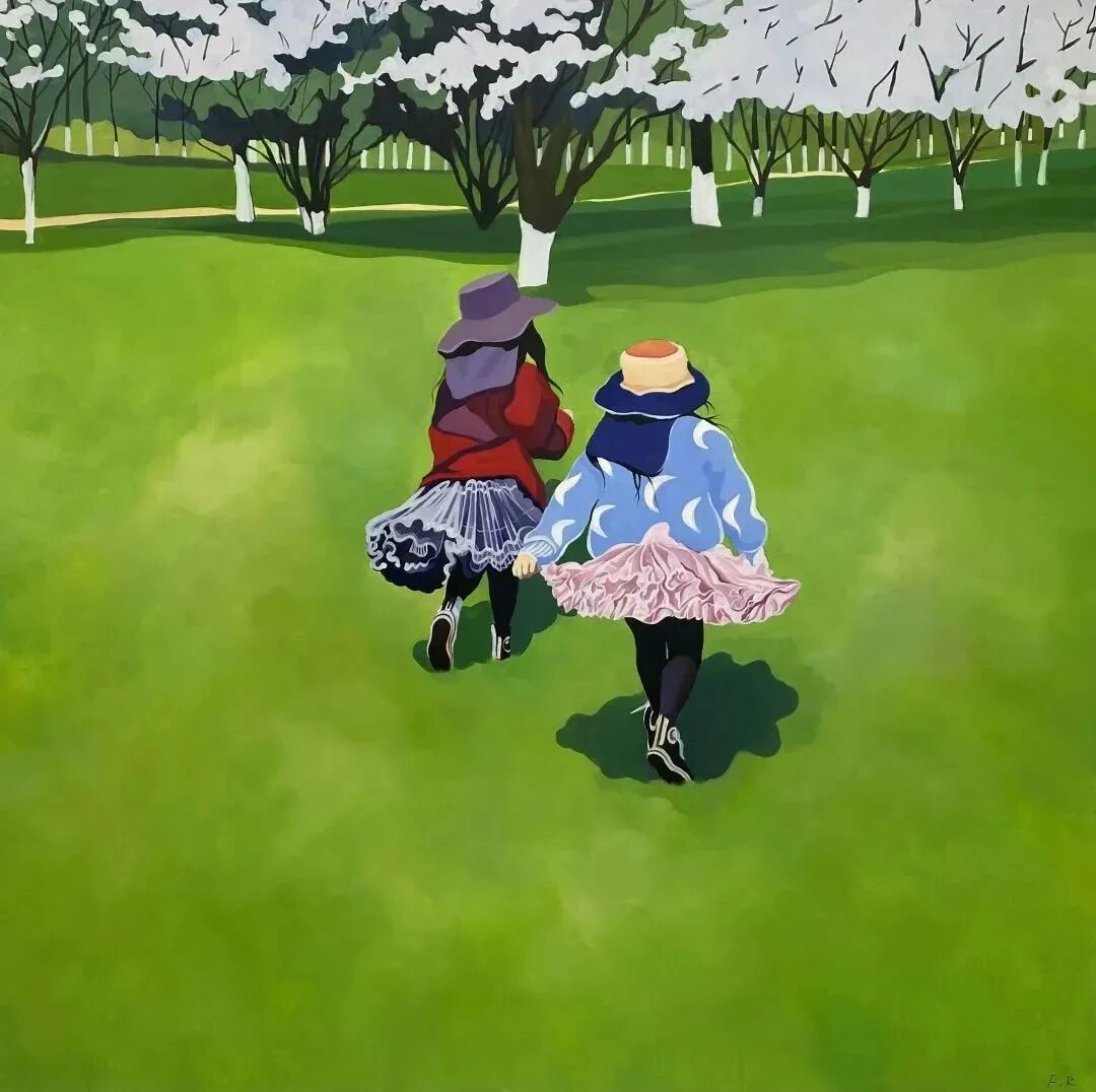 背影和少女是冯蕤主要的艺术语言,少女时期是女性身体最单薄又情感最丰富的时期,对未来充满了希冀和憧憬,随性自然的打扮和举止能给大众带来最纯洁的视觉享受。在作品中我利用背影这一人物形态,变成同为鉴赏画面的观众,也将个人情绪内敛的隐藏在背影后面,像一个尾随者,陪伴者,观察者一样审视生活,观察和描绘那些背影后面的情感与成长语境。世界并不总是美好的,面对很多不可承受之轻,会经常给冯蕤带来焦虑感。但是在绘画创作过程中,让我从极度的消极到重拾自己的自信。冯蕤也希望她的作品可以给别人带来冰冷世界里的一点点温柔,以及一点点的勇气和感动。