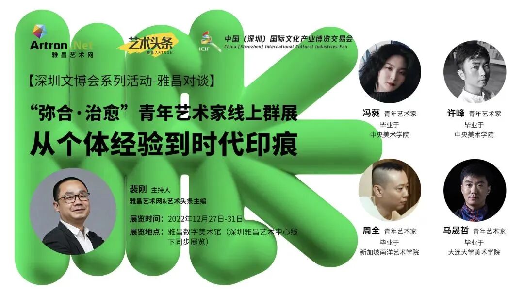 2022年12月27日,“弥合·治愈”青年艺术家元宇宙群展开幕,策展人裴刚。此次展览作为第18届中国(深圳)国际文化产业博览交易会雅昌艺术中心分会场的子单元呈现。参展艺术家:cranehehe、冯蕤、黎贯宇、翟莫梵、马晟哲、黄越、静电场朔、雲栖、袁晓蓓、郭柯君、许峰、周全。“弥合·治愈”青年艺术家元宇宙群展将永久在雅昌艺术网上展出。12月29日举办了“从个体经验到时代印痕”在线直播论坛,艺术家冯蕤、马晟哲、许峰、周全参与了此次论坛的对话,由策展人裴刚主持。