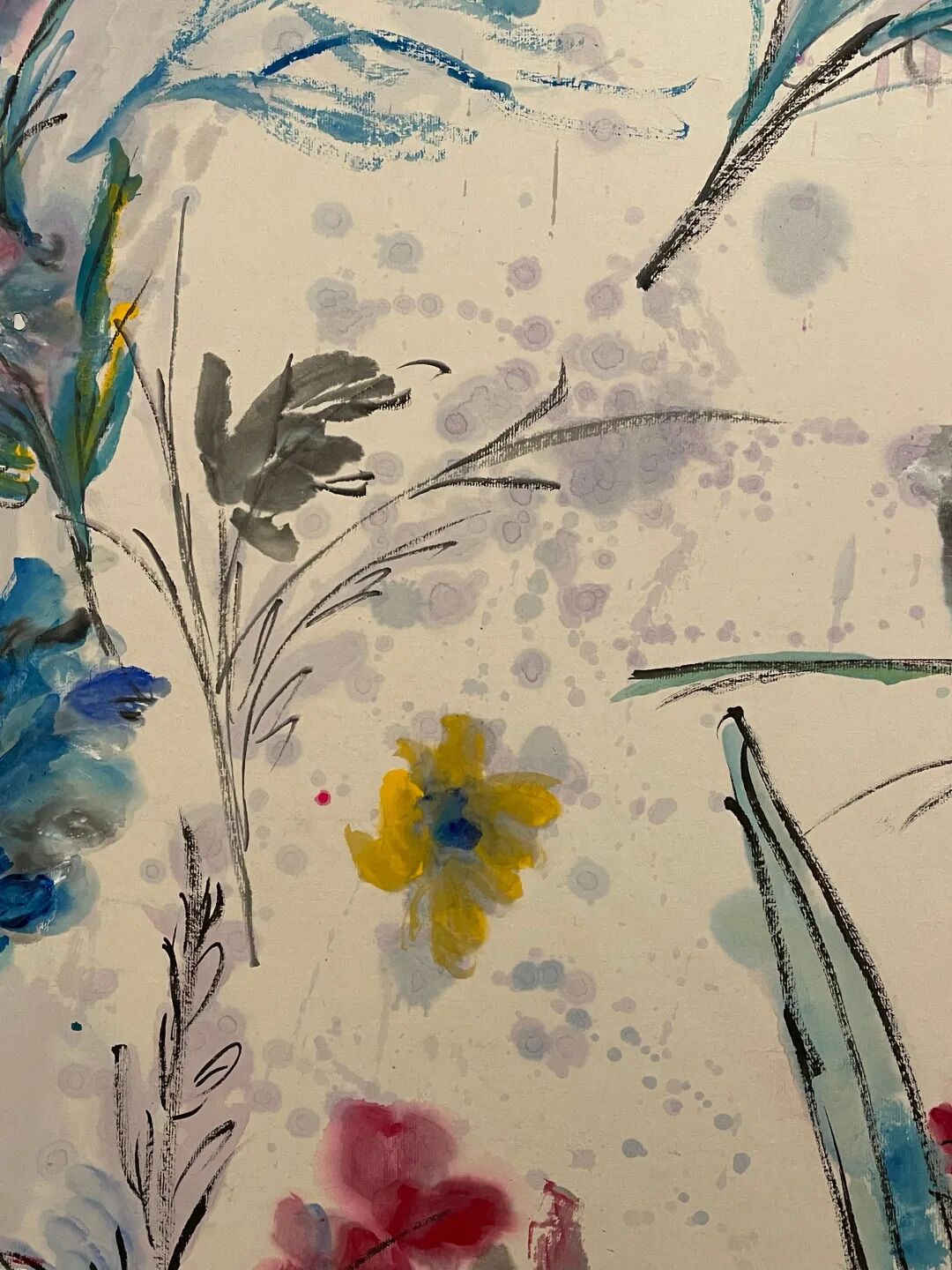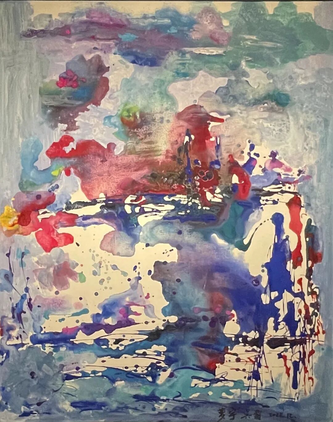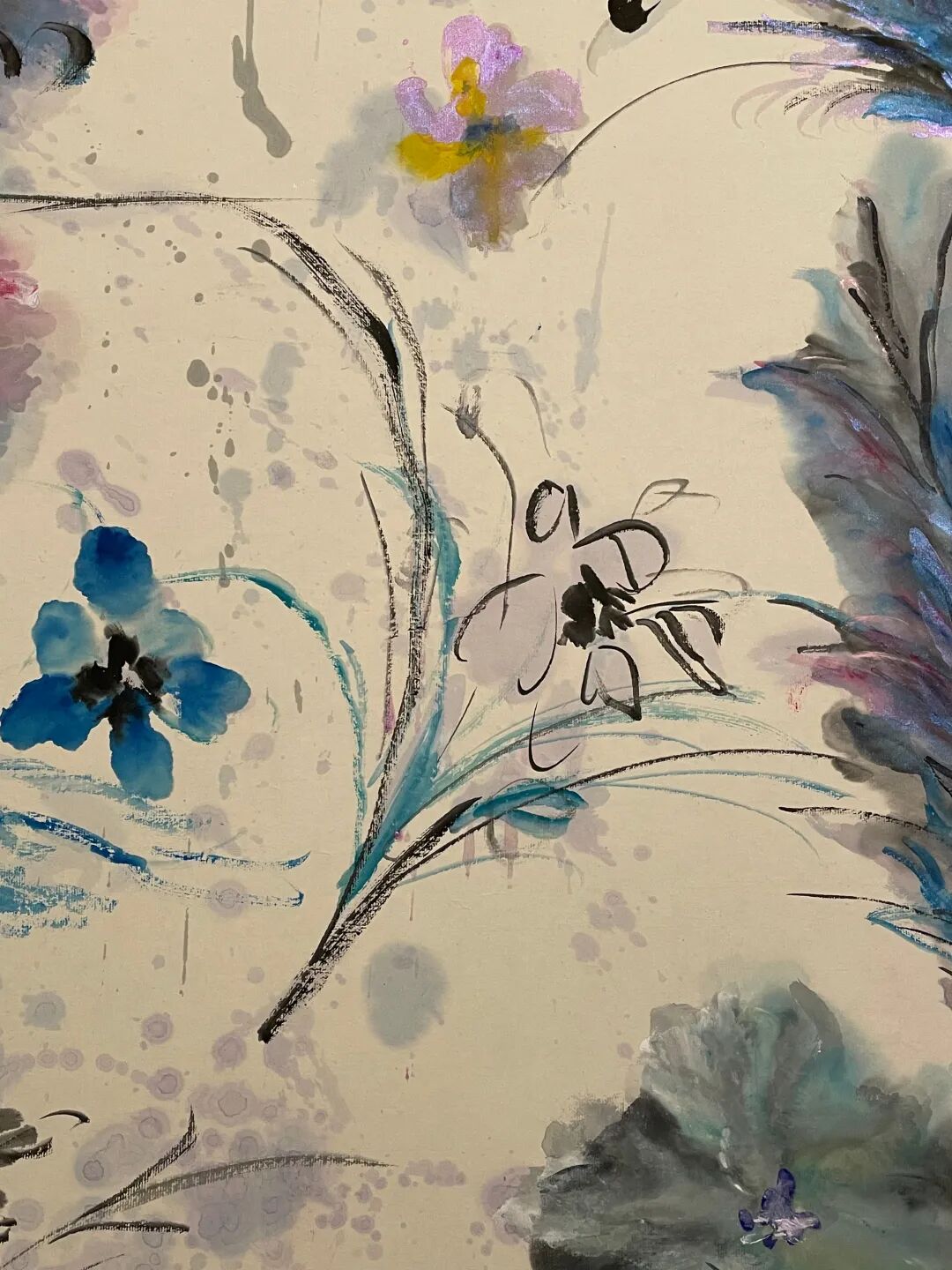 “泼彩系列”也是此次展览的重要作品。我在画这一系列时,内心很激动。我喜欢西方的表现主义,泼洒产生大色块后,再让无形变成有。我觉得这样很自由,可以很畅快的表现自己的喜怒哀乐。