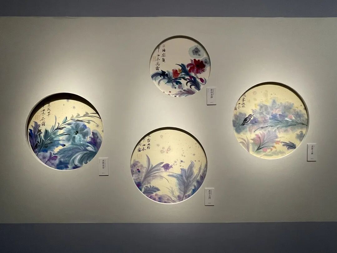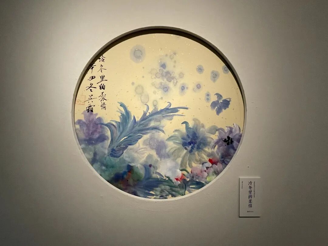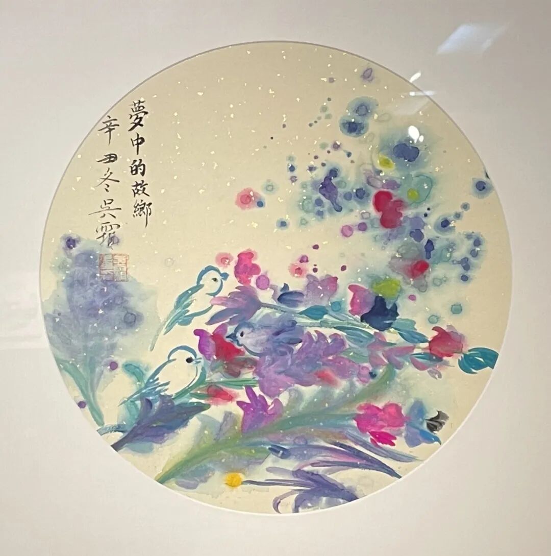 吴霜:《春、夏、秋、冬》是一件比较有创新想法的作品,对我来说也比较有挑战性,也是此次展览中最大的一幅作品。我前后创作了半个月,投入很多情感。最后完成时父亲建议我用泼彩的方式,但我觉得自己的能力有限,于是坚持了自己一花一世界的风格,慢慢勾勒渲染,也采用了一点荧光色。