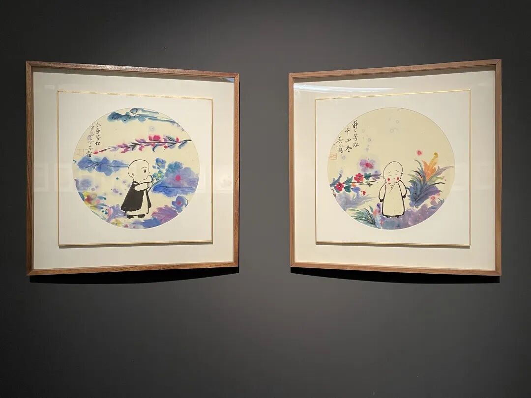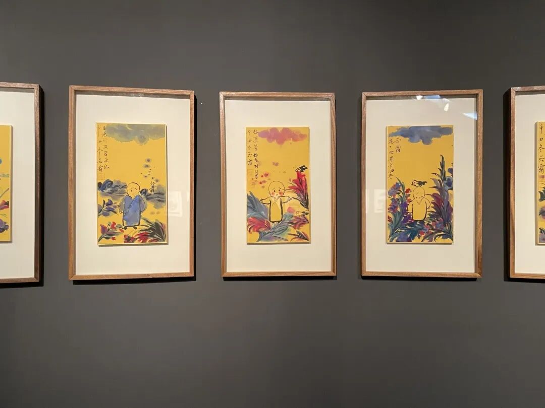 “小和尚系列”我也比较喜欢,每个小和尚都有自己的性格特征。我是一个有童心的人,很喜欢小孩子肉嘟嘟的脸。一次翻手机,无意中看到了小和尚的表情,就很想将他画到画中。我在小和尚旁边画了一些花草,让他显得更加活泼可爱。其中一幅我取名为《静静等你》,小和尚虽然做了和尚,但我觉得他对尘世间还是向往的,他天真活泼中又带着一些叛逆。