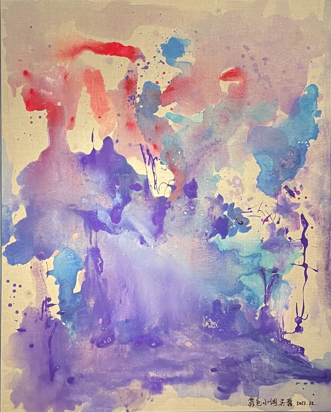这一系列中我最喜欢的是《雪后》,是去年下完雪,在父亲工作室创作的。当时工作室的朋友都在看雪,而我却在昏昏欲睡。当我站在工作室门口,雪后的空气一下子吸到肺部的感觉,激发了我创作的欲望。于是,晚上我在暗暗的灯光下,创作了这幅作品,画中虽然没有具象的内容,但有着冬天寒冷的意境,色彩真的很神奇。